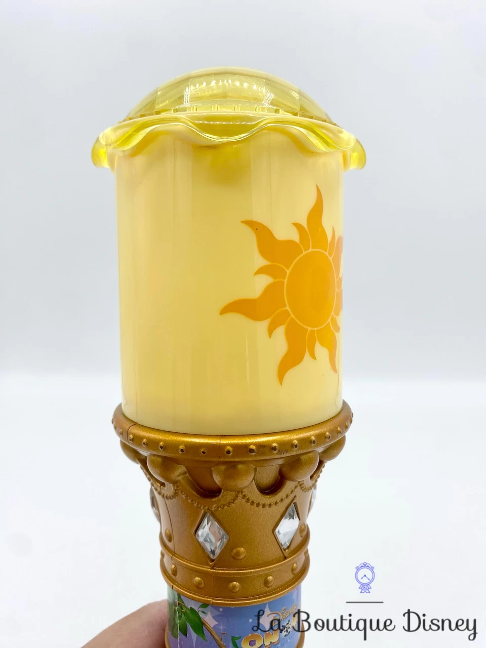 Baguette en plastique dorée sur le thème de Raiponce. La baguette possède à son extrémité la célèbre lanterne avec le soleil, symbole du Royaume de Corona. Sur le manche, il y a des petits strass avec un autocollant sur lequel on peut y voir la princesse Raiponce, Flynn Rider ou encore l’inscription « Disney On Ice ». Bouton sur le manche doré permettant à la baguette de s’éclairer en différentes couleurs.