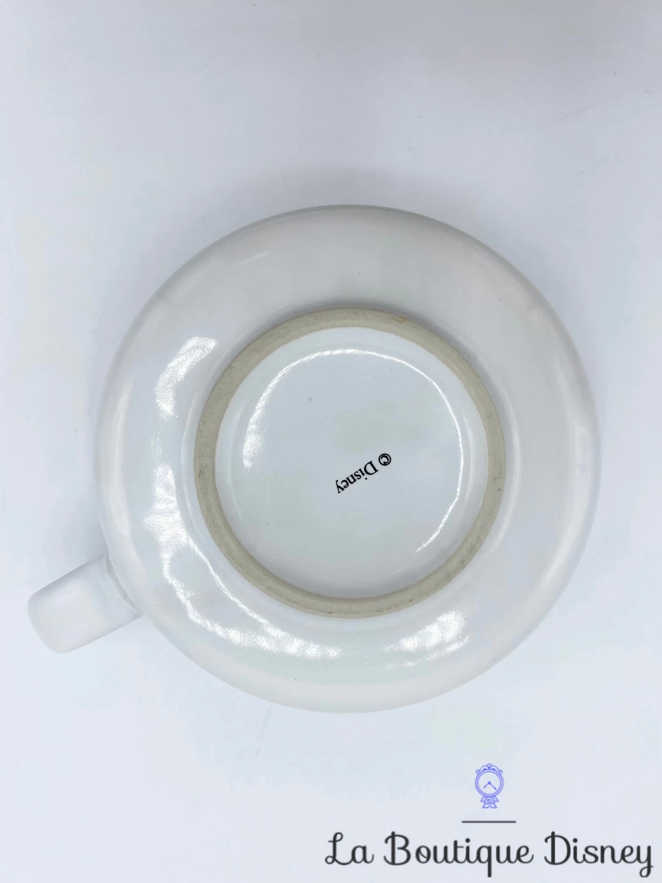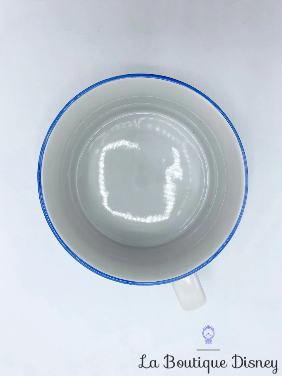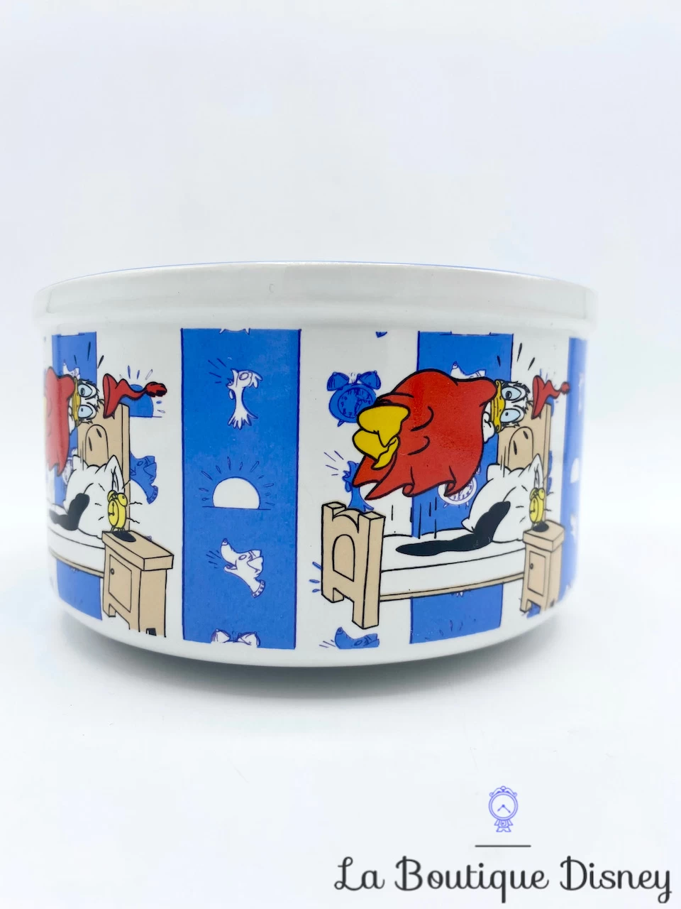 Bol en céramique rayé blanc et bleu représentant le célèbre canard, Donald Duck . Il est représenté cinq fois autour du bol de façon identique à savoir : il y a un lit avec une table de chevet et un réveil qui sonne. Donald est surpris par la sonnerie et fait un bond à l’horizontal au dessus du lit. Il est encore revouvert d’une couverture rouge et d’un bonnet de nuit rouge. Il a d’énormes yeux écarquillés. Sur les rayures bleues, on découvre quelques motifs liés au levé du jour, un coq, un soleil levant et une tête de chien qui aboie. Intérieur du bol et anse blanc.