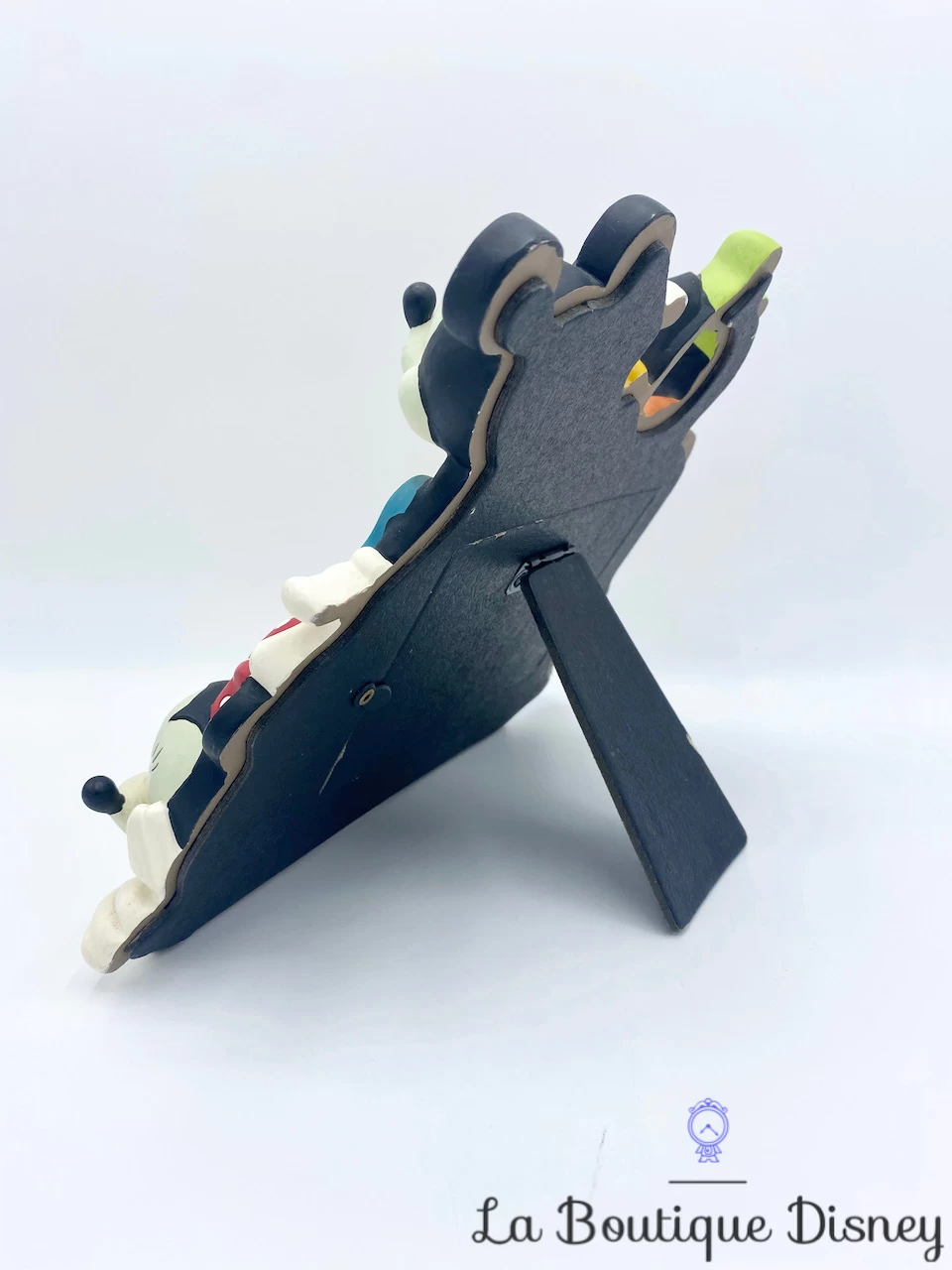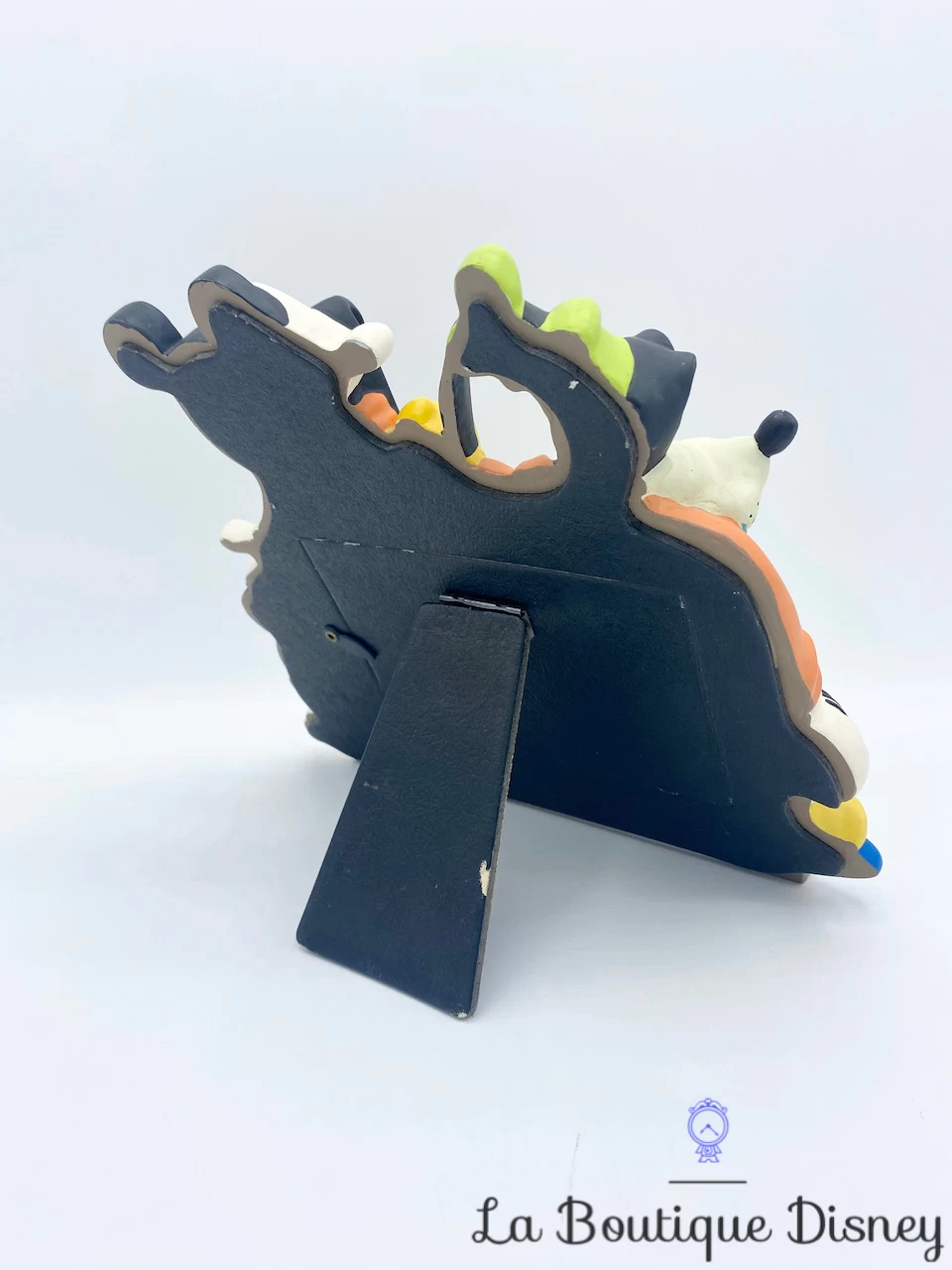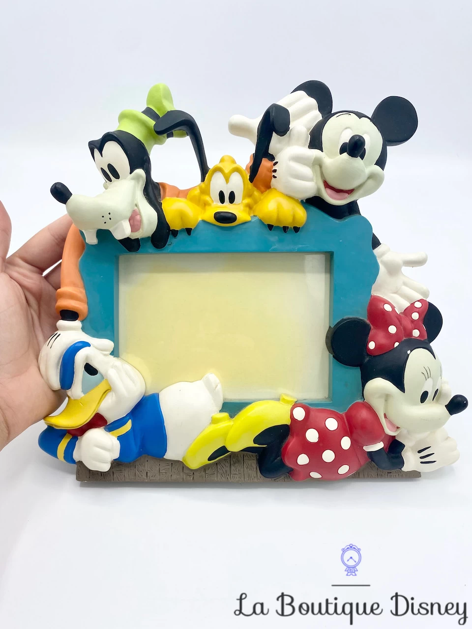 Cadre en résine bleu avec tout autour vos personnages préférés : Mickey Mouse, Minnie Mouse, Donald, Dingo et Pluto. Au milieu, espace pour y mettre une photo. Cadre de table se posant grâce à un chevalet à l’arrière. Ouverture arrière pour y insérer la photographie de votre choix. Très belle qualité des personnages.