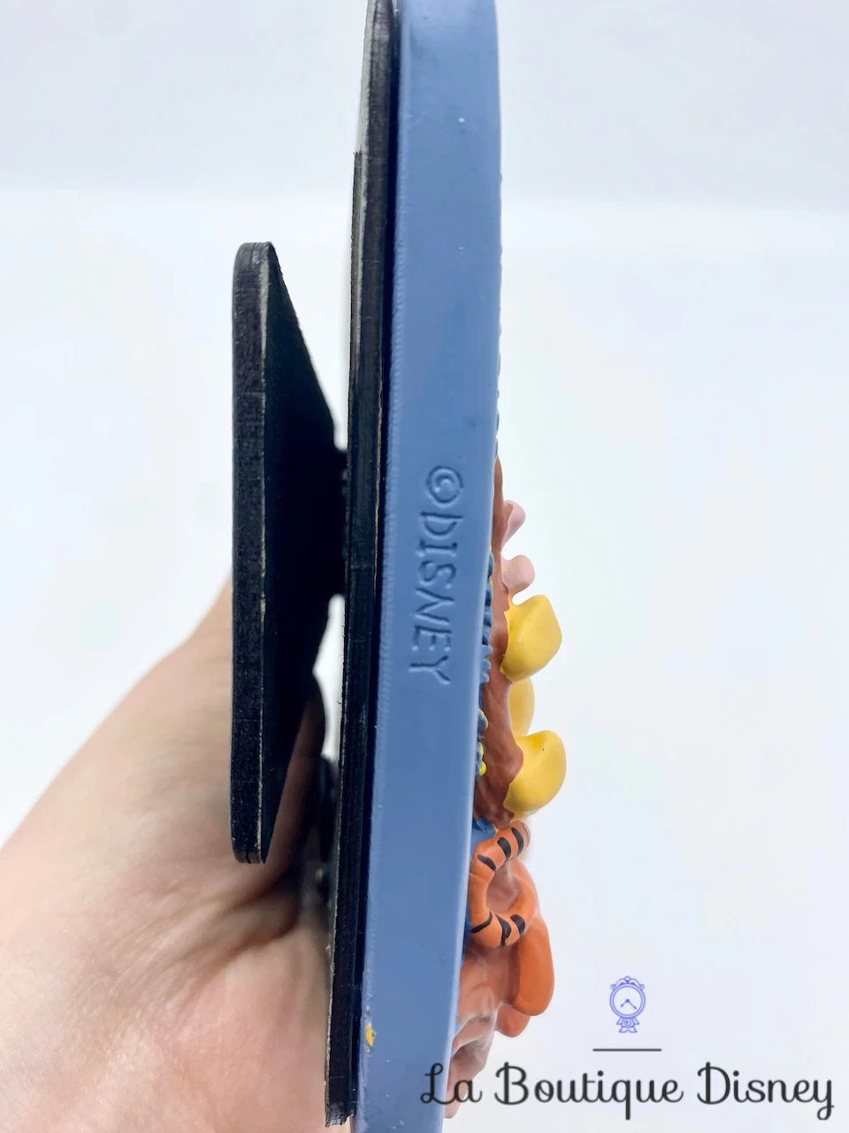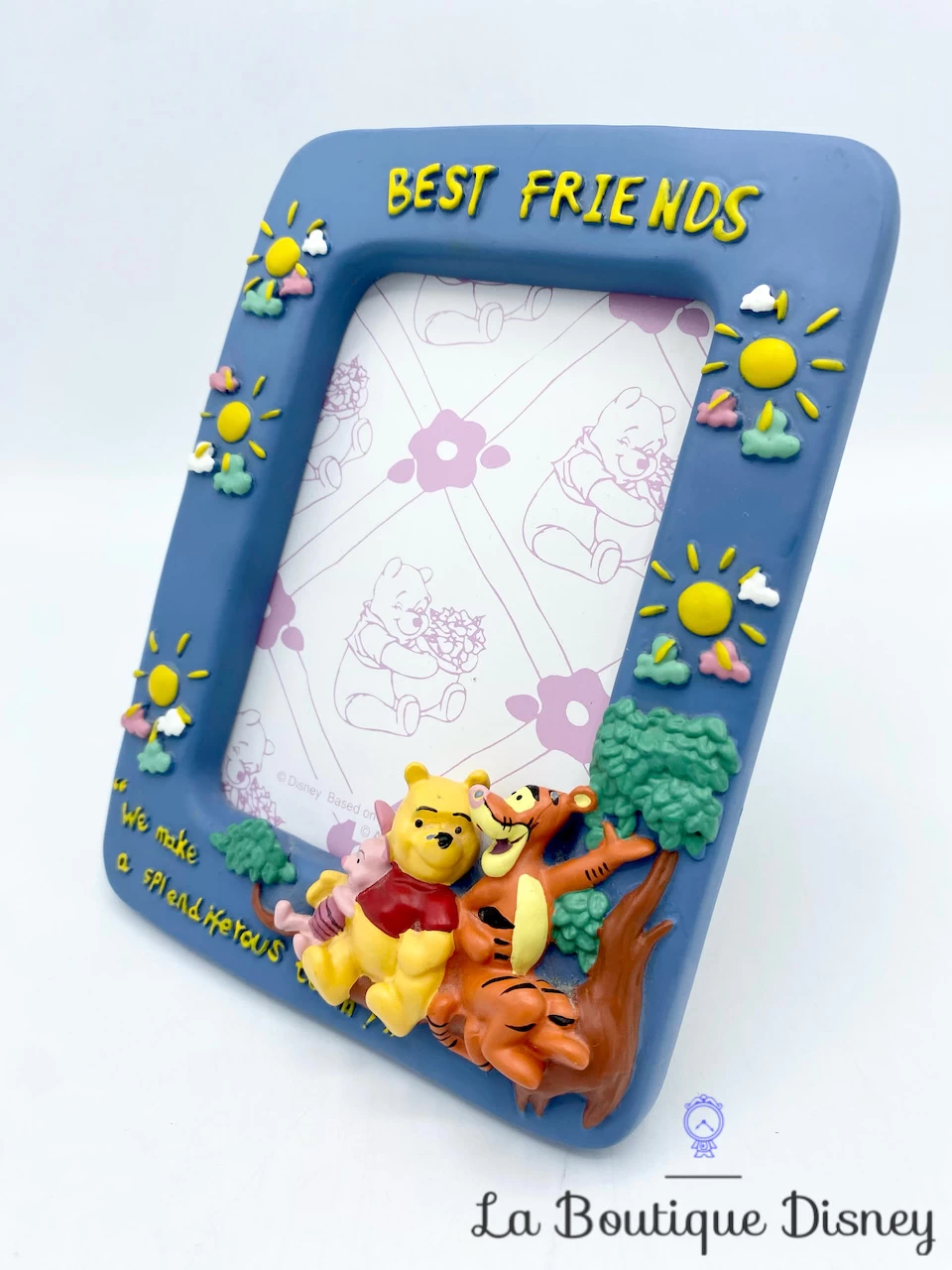 Cadre en résine peint en bleu sur le thème de Winnie l’ourson. Vos trois personnages préférés sont présents en bas du cadre : Winnie l’ourson est assis sur un tronc d’arbre en compagnie de Porcinet le petit cochon rose et de Tigrou le tigre orange de la forêt des Rêves bleus. Sur la partie haute, il y a une inscription en jaune « Best Friends » puis sur le bas « We make à splendiferous team ! ». Des petits soleils avec des nuages verts, blancs et rose viennent se rajouter à la décoration. Cadre de table tenant debout grâce à un petit chevalet à l’arrière. Format de la photographie à insérer : 9×13 cm.
