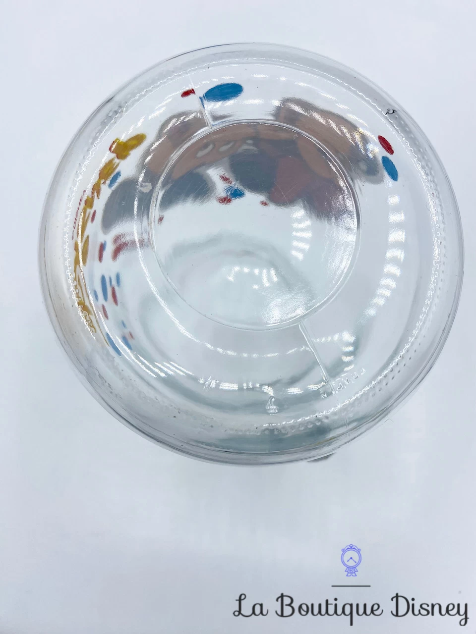 Pichet en verre épais avec motif imprimé de vos deux personnages préférés : Mickey et Minnie ! Il y a à coté de leurs visages l’inscription « Disney » en rouge et jaune. Ils sont entourés de ronds rouges et bleus. Anse en verre également.