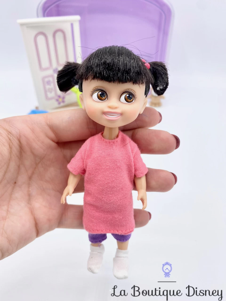 Ensemble de jeu avec Mini Poupée en plastique représentant la petite fille Booh. Coffret de 5 pièces inspirées du film Monstres et Compagnie : petite poupée, doudou, casque, Bob, porte. Booh a une chevelure noire très réaliste avec des petites couettes, elle porte son petit ensemble avec son pantalon violet et son grand tee-shirt rose. Sa tête, ses bras et ses jambes sont articulées. La petite valise transparente et violette a une poignée de transport pour pouvoir emmener votre nouvelle poupée partout avec vous !