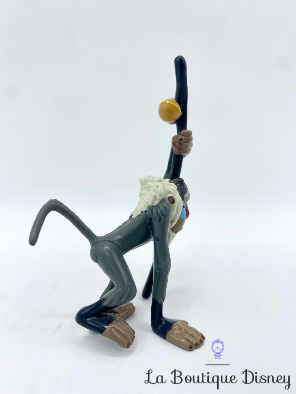 Figurine en plastique représentant Rafiki, le vieux singe conseiller, considéré comme le chaman de la tribu et parrain de Simba. Il est gris, noir et beige. Il a visage coloré en bleu et rouge. Il a une barbe en poils blancs et tient dans sa main un énorme bâton lui servant à transporter les fruits pour baptiser les lionceaux.