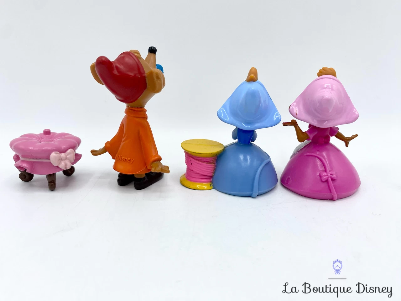 Figurine en plastique de trois petites souris présentes dans le dessin animé Cendrillon : Jaq Jaq ou Jac Jac la souris au manteau rouge, Mary la souris à la robe bleue accompagnée d’une bobine de fil rose et Perla la souris à la robe violette. Mary et Perla sont des figurines « Bobblehead » (têtes sur ressort).