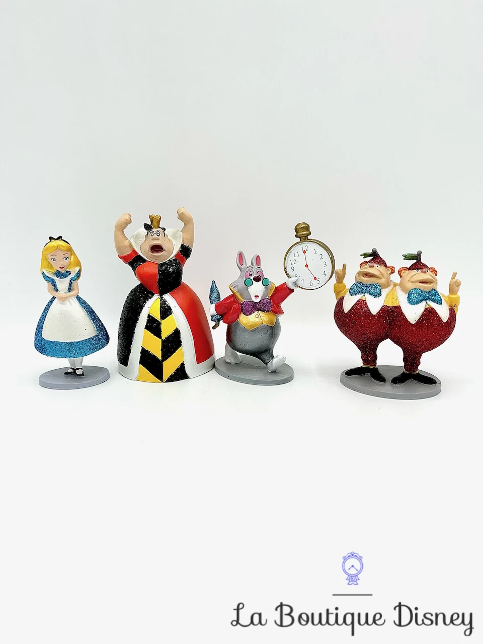 Ensemble de 4 figurines en PVC avec les personnages suivants : Alice dans sa robe bleue et blanche, la méchante Reine de Coeur, le Lapin blanc avec sa montre car il est toujours en retard et enfin les jumeaux Tweedle Dee et Tweedle Dum. Les figurines sont sur socles gris et sont de très belle qualité avec de nombreuses paillettes.