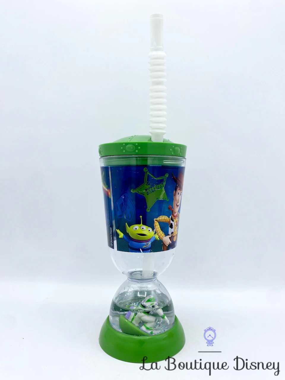 Gobelet vert en plastique représentant 4 personnages du dessin animé Toy Story : Buzz l’éclair le space ranger de l’espace, Woody le cow boy, Rex le dinosaure vert et un petit extraterrestre Alien. À la base du gobelet, il y a un espace avec de l’eau et une petite figurine de Buzz l’Éclair qui flotte et qui bouge selon l’orientation du verre. Paille blanche sur le dessus. Couvercle amovible pour remplir et nettoyer l’intérieur du gobelet.