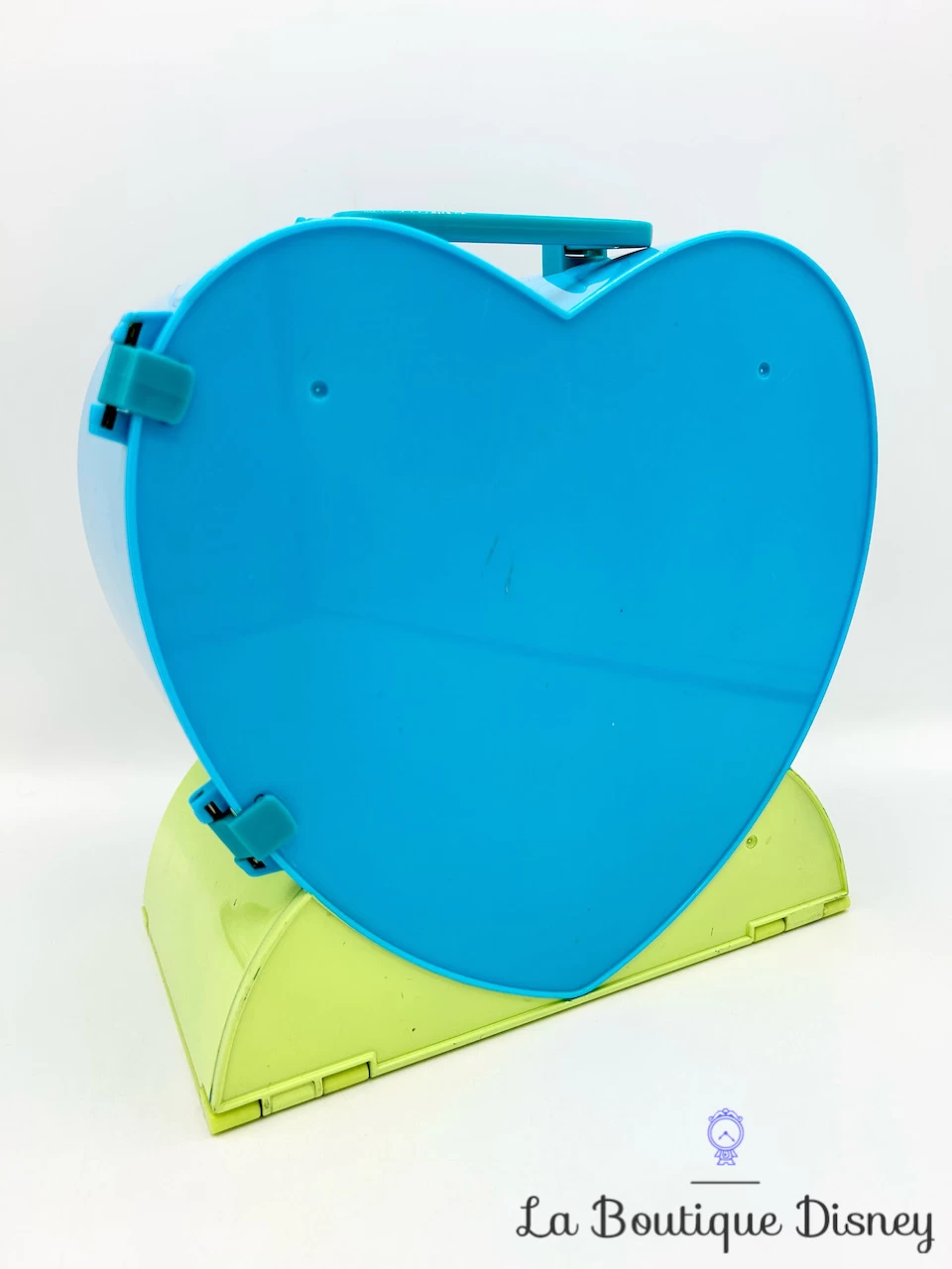 Ensemble de jeu en plastique comprenant une grosse valise bleue et verte en forme de coeur avec le portrait de la princesse Ariel sur le devant. La mallette peut se transporter grâce à une petite anse sur le dessus. Elle se déplie pour laisser place à un grand espace de jeu avec les trois figurines Playset de La Petite Sirène inclues à savoir Ariel, le Roi Triton ainsi qu’Ursula. Au centre du plateau un château rose est présent. Sont également fournis des accessoires comme une armoire, une chaise et une coiffeuse.