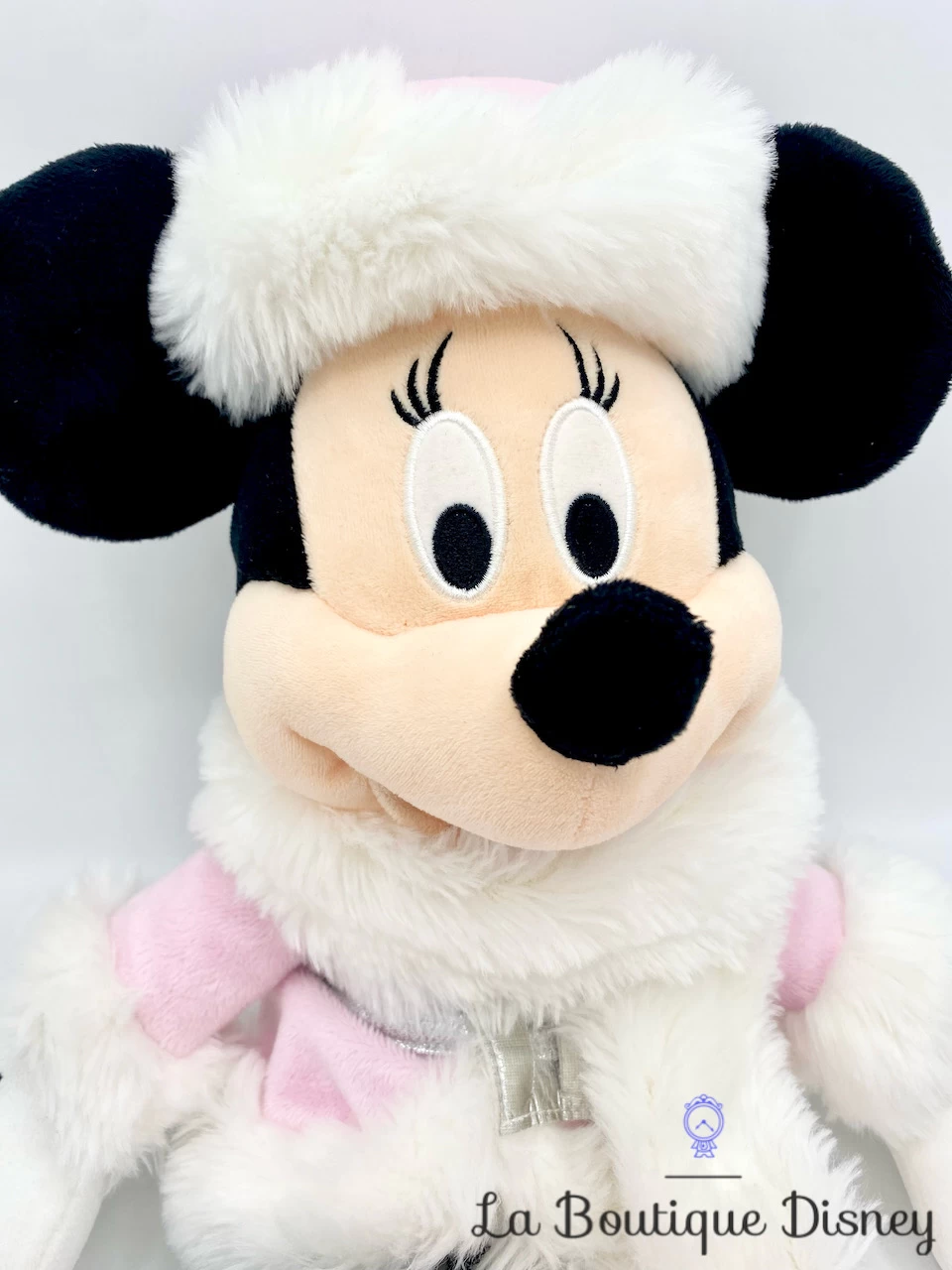 Peluche de la célèbre souris Minnie Mouse. Minnie porte un manteau rose bordé de fourrure blanche fermé par une ceinture couleur argent ainsi des chaussures assorties. Un grand chapeau rose « une chapka » avec de la fourrure blanche orne sa tête. Yeux et bouche brodés. Écusson « Disney Store Exclusive » sous le pied de la peluche.