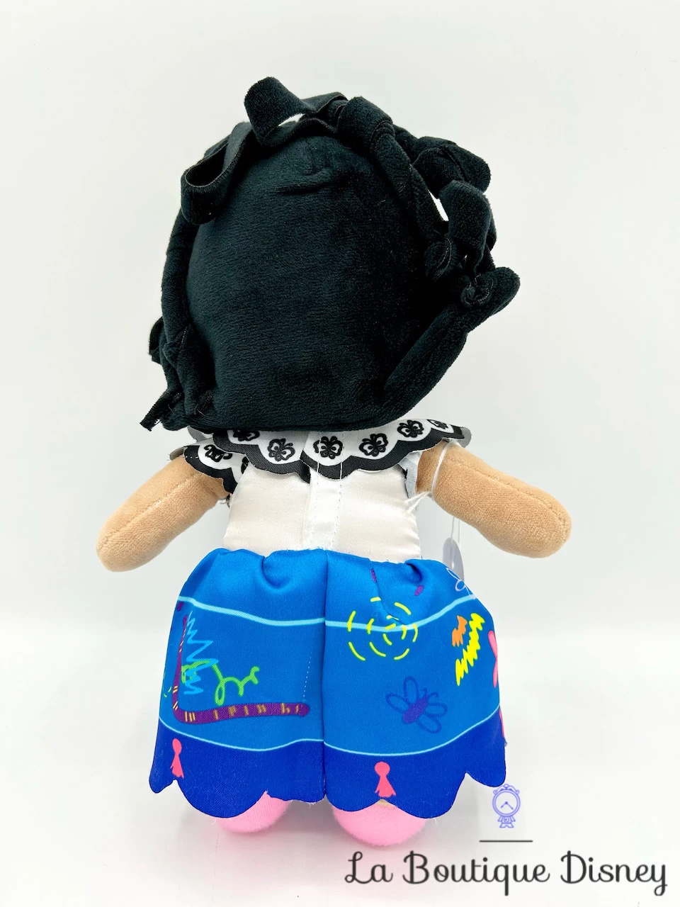 Peluche de Mirabel, la plus jeune fille de la famille et la seule de la famille Madrigal à n’avoir aucun don magique. Mirabel a un jolie visage brodé, avec des yeux noirs et des lunettes rondes vertes. Elle porte sa robe comme dans le dessin animé avec un haut blanc et un jupon bleu.