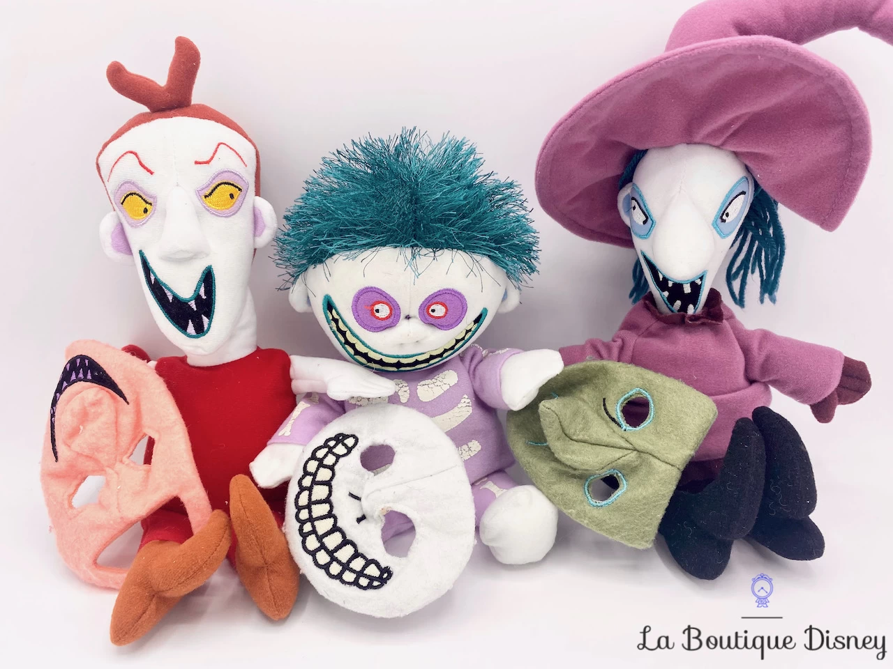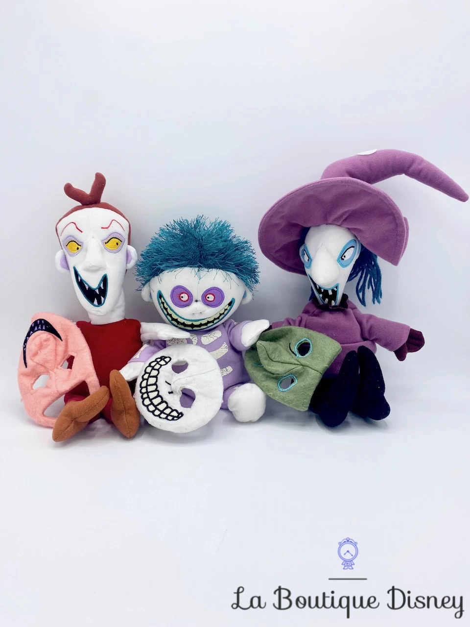 Lot de 3 peluches d’Am Stram et Gram, aussi appelés Lock Shock et Barrel en version officielle. Ce sont trois petits garnements qui se déplacent toujours dans une baignoire qui marche toute seule. Ils répondent aux ordres d’Oogie Boogie, le Maire d’Halloween. Ils ont pour mission de capturer le Perce Oreille sur ordre de Jack Skellington ! Ils portent chacun un masque. Am est le petit bonhomme déguisé en diable, Stram est la fille déguisée en sorcière et Gram porte un déguisement de squelette.