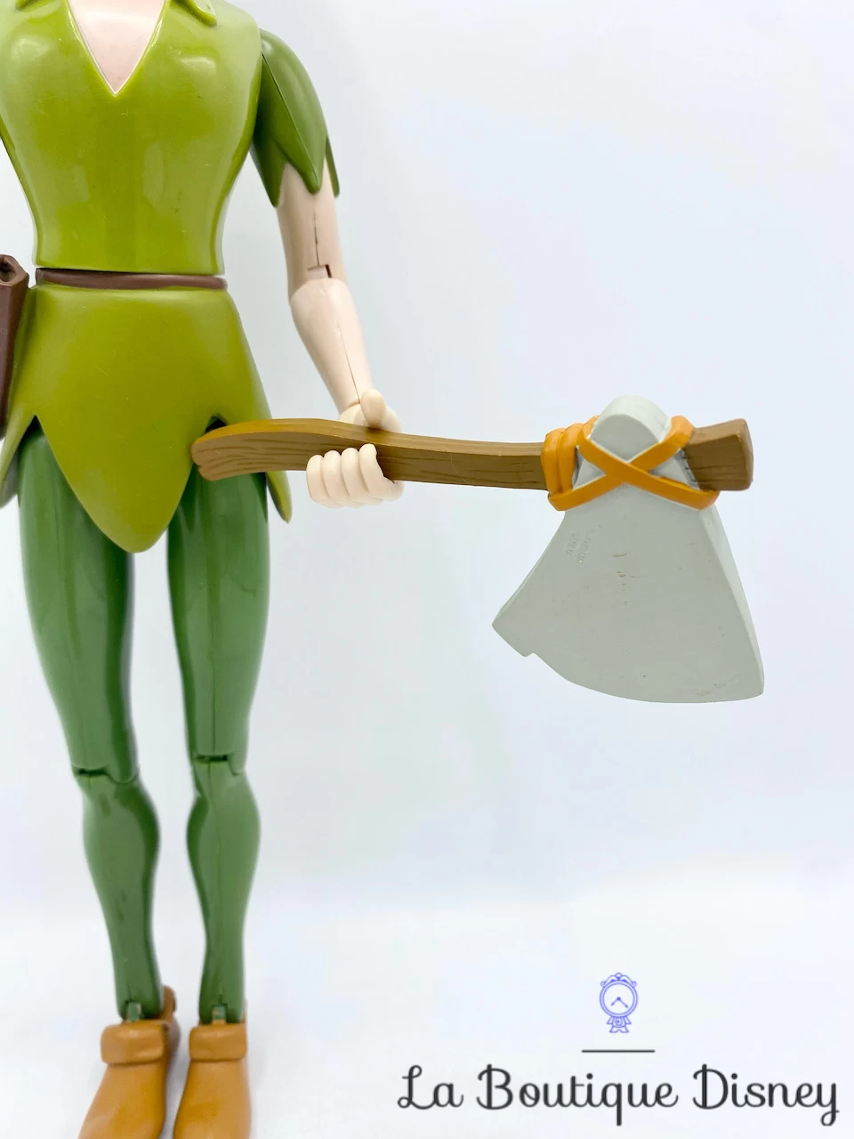 Poupée en plastique / Figurine d’action de Peter Pan. Il a des cheveux marron, des yeux marron et une grande bouche souriante. Il porte son haut et son bas couleur vert habituel, une ceinture marron et des grandes chaussures pointues marron. Il est articulé au niveau des bras et des jambes. Il tient à la main une petite hâche.