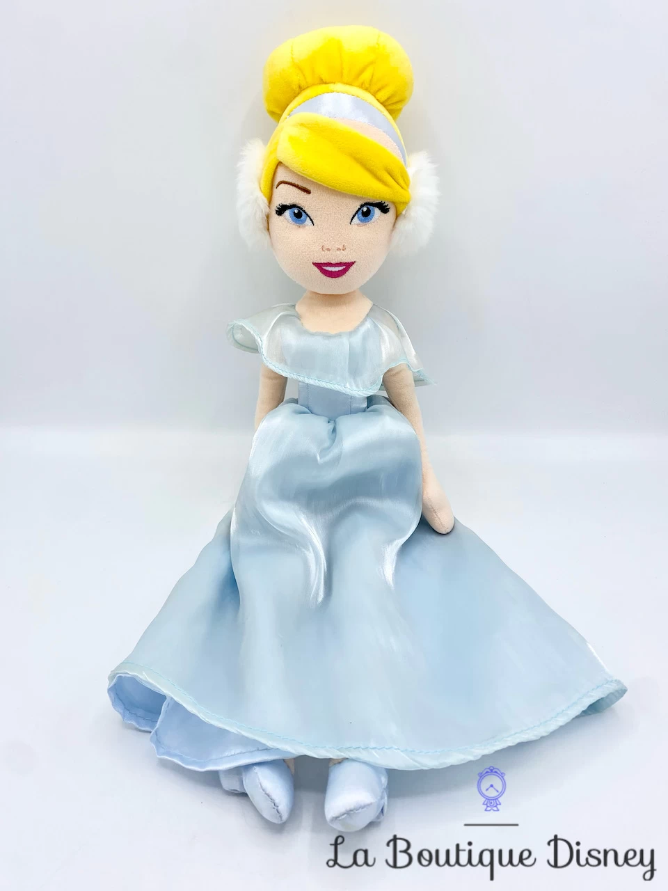 Peluche de la princesse Cendrillon avec un sublime visage brodé, des yeux bleus et des cheveux blonds remontés en chignon. Elle porte une très jolie robe bleu clair en satin avec un voile donnant un effet brillant à la tenue. La princesse porte dans cette version un cache oreilles en fourrure blanche. Elle est tout à fait prête pour affronter le froid de l’hiver !