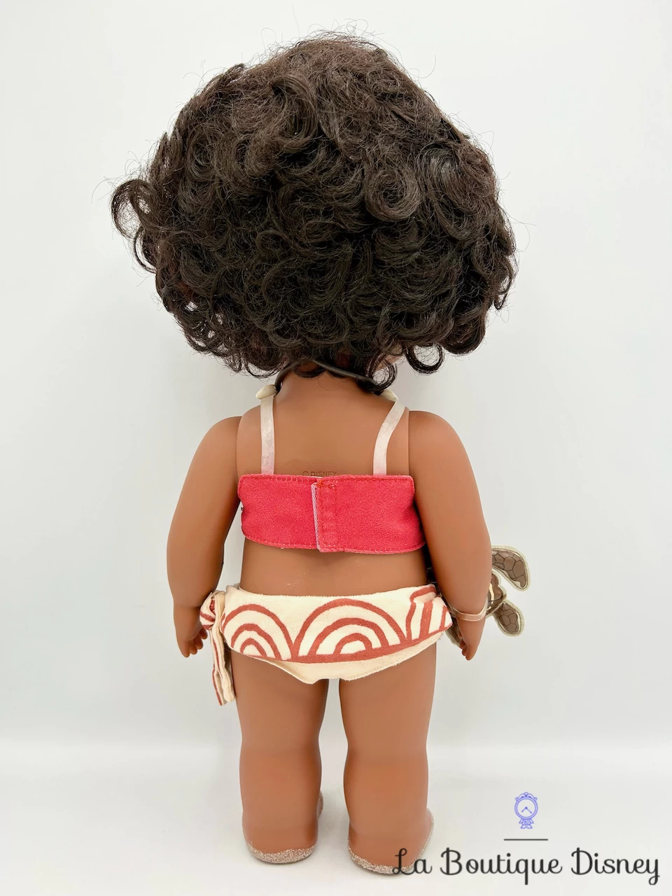 Poupée en plastique représentant Vaiana bébé. Tête, bras et jambes articulés. Vaiana a des cheveux courts marrons foncés. Elle porte une tenue avec un haut rouge et une culotte beige. Elle porte un collier en plastique autour du cou. Sable collé sur les pieds. Elle a un petit doudou en tissu rembourré autour du poignet, représentant une tortue de mer.