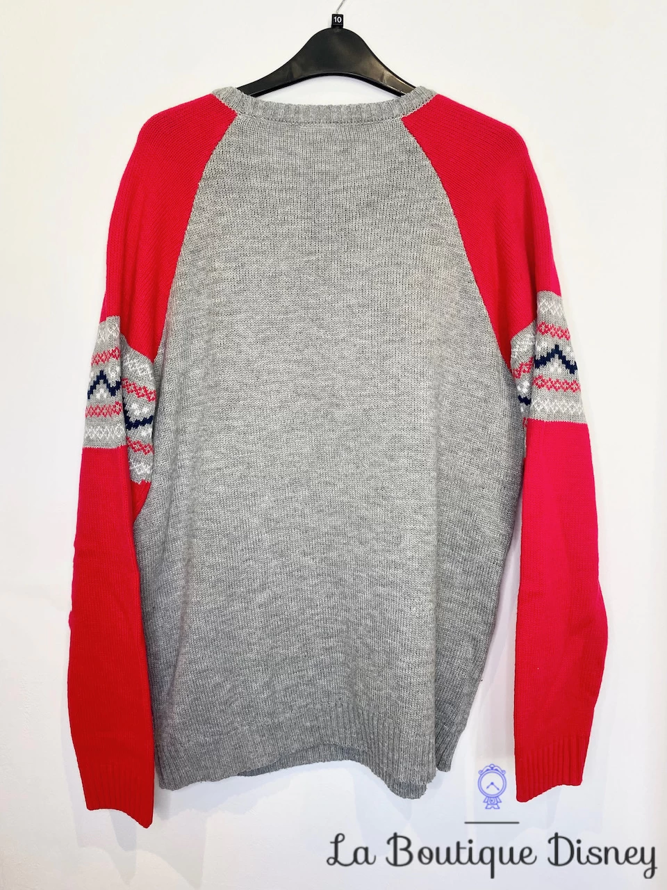 Pull gris à manches longues de Noël à l’effigie de Grincheux, le petit nain grognon. Il porte une tenue de Père Noël avec un bonnet et un manteau rouge. Manches du pull rouges. Col rond. Motif jacquard sur le devant. Inscription brodée « Grumpy ».