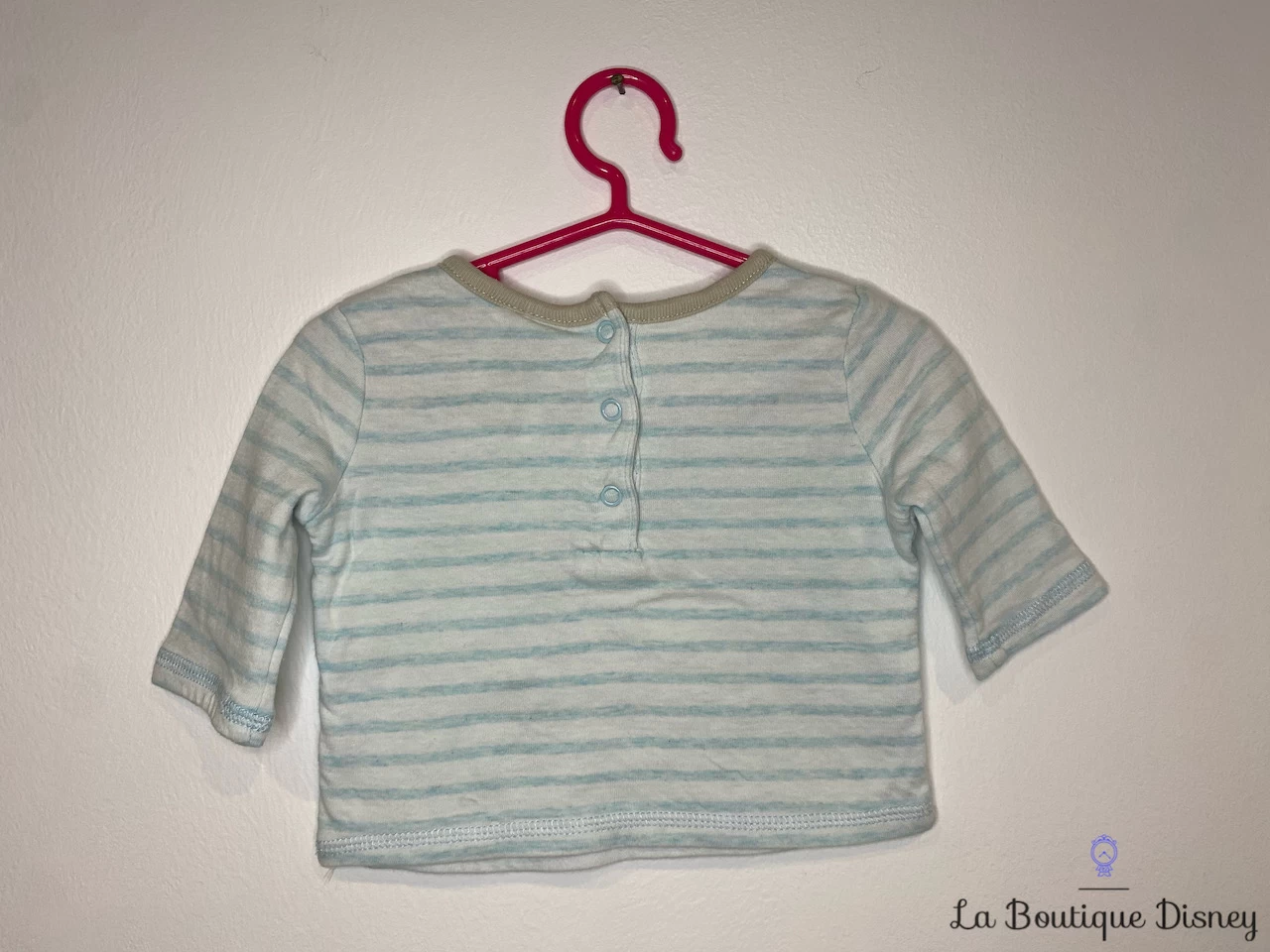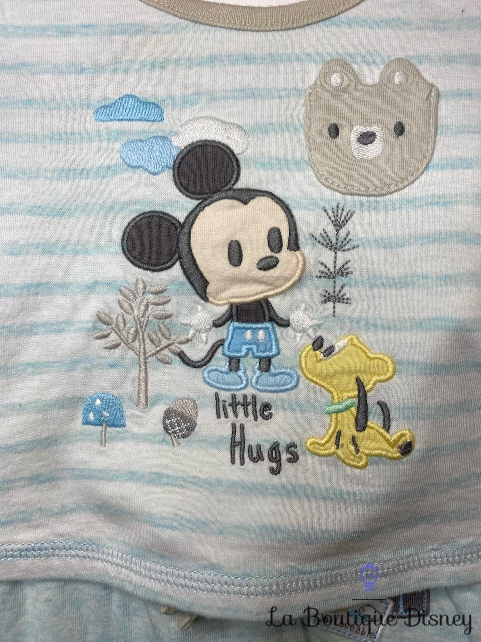 Pyjama rayé 2 pièces blanc et bleu ciel 100% coton composé d’un haut à manches longues à rayures et d’un pantalon. Sur le haut, le motif de bébé Mickey est brodé en compagnie de son chien jaune préféré bébé Pluto. Autour de lui, un paysage composé de deux arbres avec au pied un gland et un champignon, des nuages et une tête d’ourson sont brodés aussi. Il y a une inscription « Little hugs » sous la scène. Fermeture par trois boutons-pressions pour faciliter l’enfilage. Le pantalon se serre avec un cordon. Il est rayé comme le haut mais sur un fond bleu et comporte trois jolis petits écussons cousus à la taille avec un rappel des motifs du haut. Un empiècement rayé blanc et bleu ciel comme le haut est cousu sur chaque jambe au niveau des genoux.