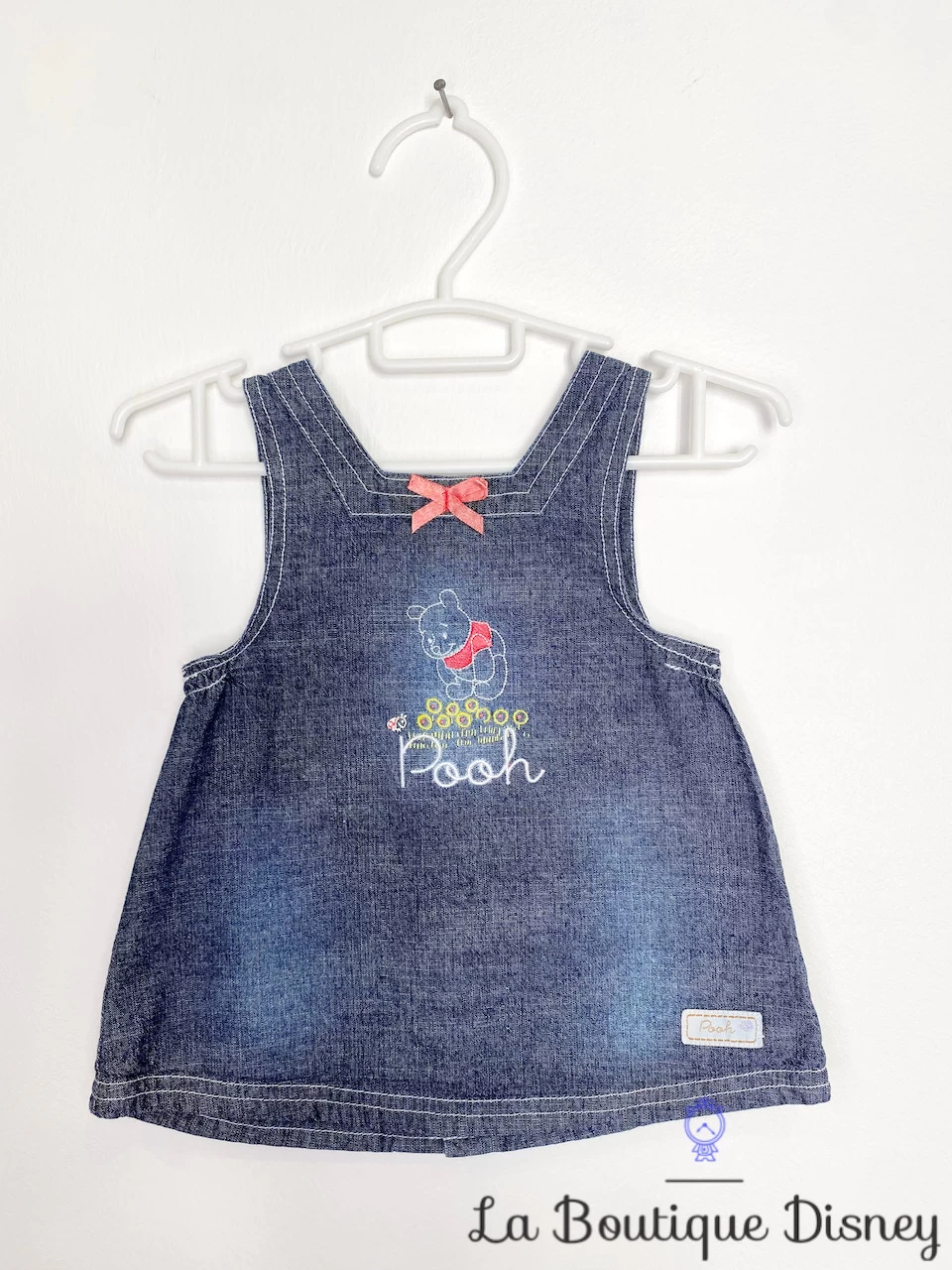 Robe 100ù coton avec effet jean sans manche. Petit noeud rose sur le devant. Broderie de Winnie l’ourson en blanche et rose avec inscription « Pooh ». Fermeture arrière par 5 boutons pressions.