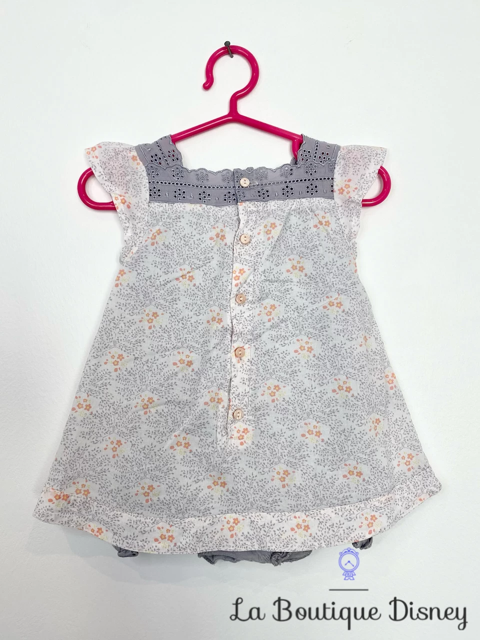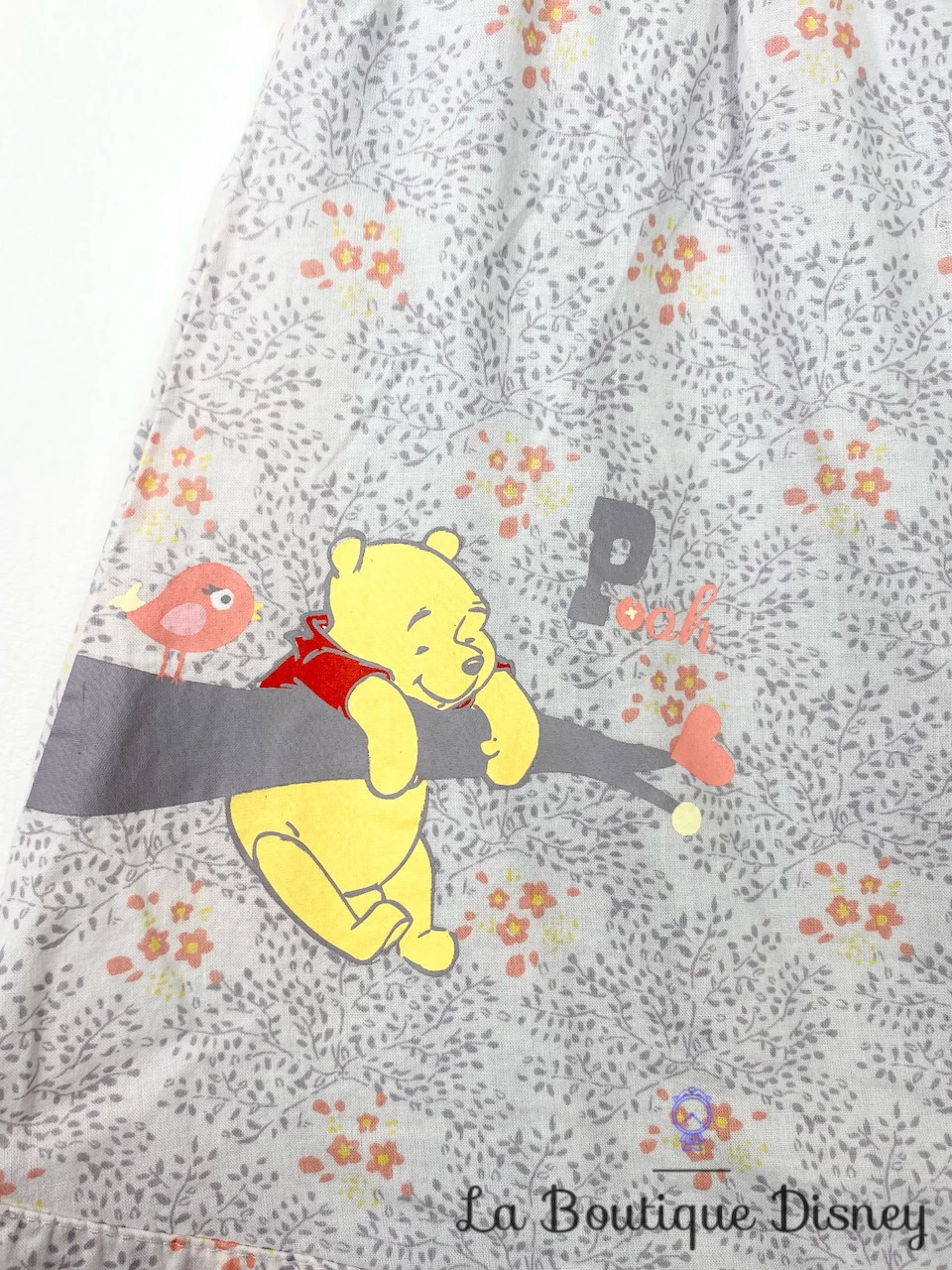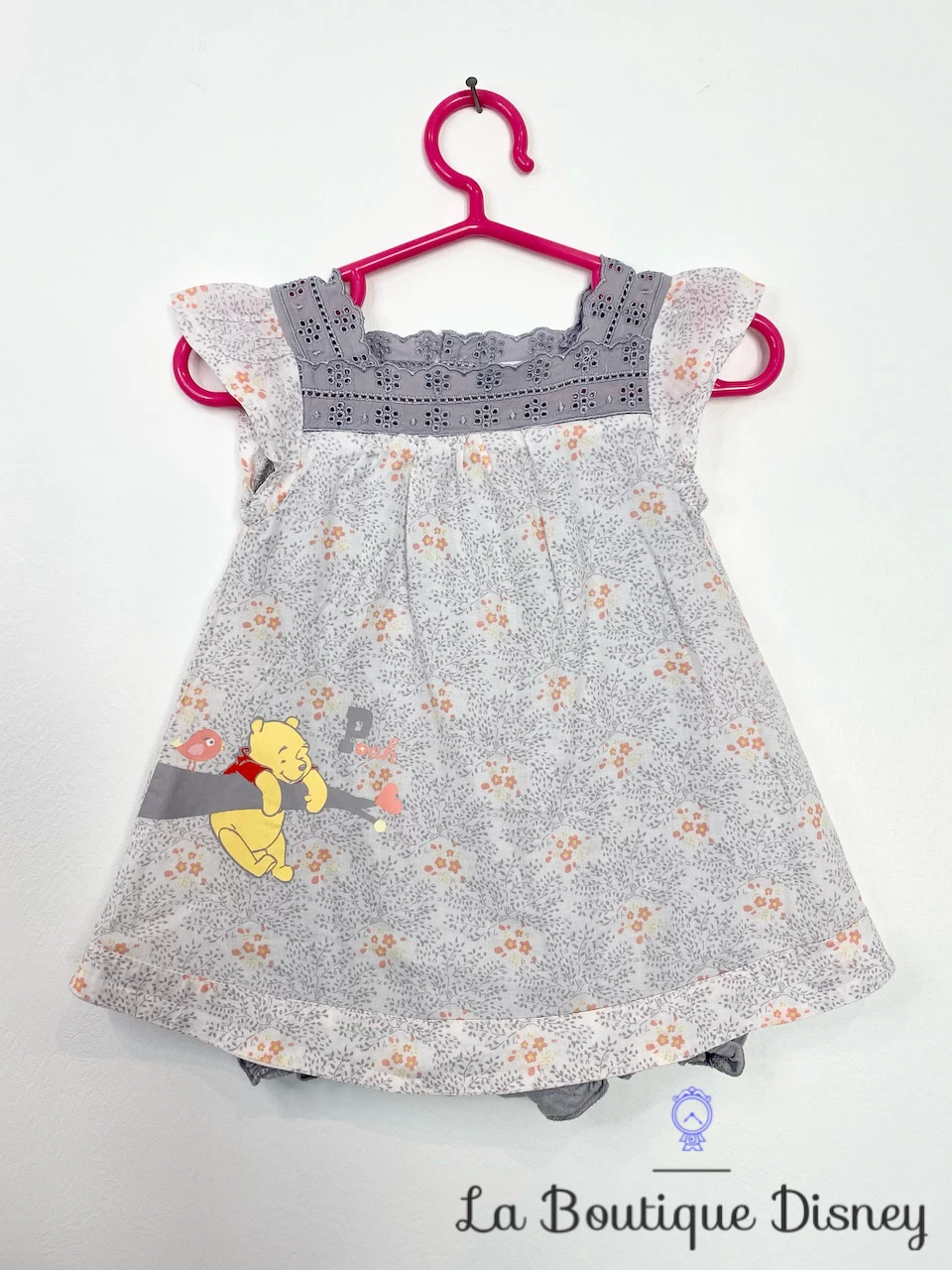 Robe 100% coton dans les tons de gris clair. Col dentelle gris foncé avec des motifs de petites fleurs brodées. Motif sur fond gris clair de branches d’arbres avec des petites fleurs rose orangées. Motif imprimé du célèbre ours jaune Winnie l’ourson accroché à une branche d’arbre et accompagné d’un petit oiseau. Inscription « Pooh » en gris et rose. Fermeture arrière par 5 petits boutons (un bouton supplémentaire fournie, cousu à l’étiquette). Robe doublée (coton également) avec une fermeture style body (trois boutons pressions à l’entrejambe).
