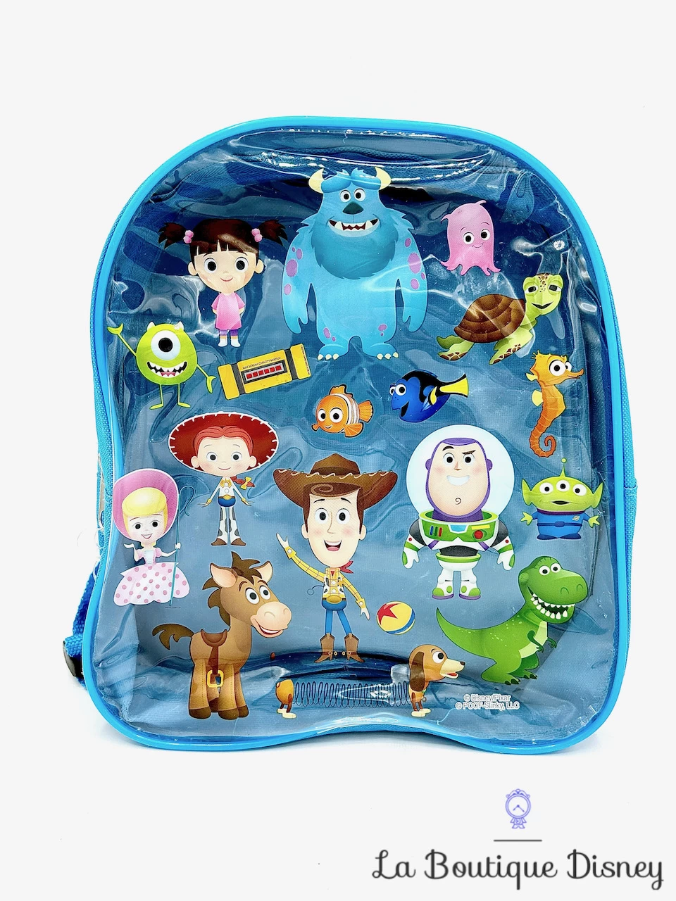 Petit sac à dos pour enfant bleu avec le devant du sac transparent. Il y a une multitude de petits personnages sur imprimés sur le devant comme Sulli, Bob, Boo, Némo, Dory, Crush, Perle, Hippo, Jessie, la Bergère, Pile Poil, Zig Zag, Woody, Buzz, Rex ou encore un Alien ! Anses bleues réglables.