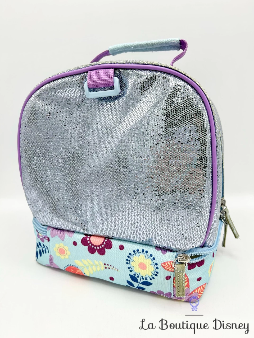 Sac isotherme bleu clair brillant avec la représentation des deux princesses Elsa et Anna. Autour d’elles se trouvent des fleurs violettes sur un fond à paillettes. A l’intérieur se trouve un grand compartiment avec un petit filet bleu (fermeture scratch). Petite anse sur le dessus pour tenir le sac à la main. Double fermeture éclair. Grande pochette de rangement à fleurs sous la glacière pour un deuxième compartiment. Idéal pour transporter votre prochain pique nique !