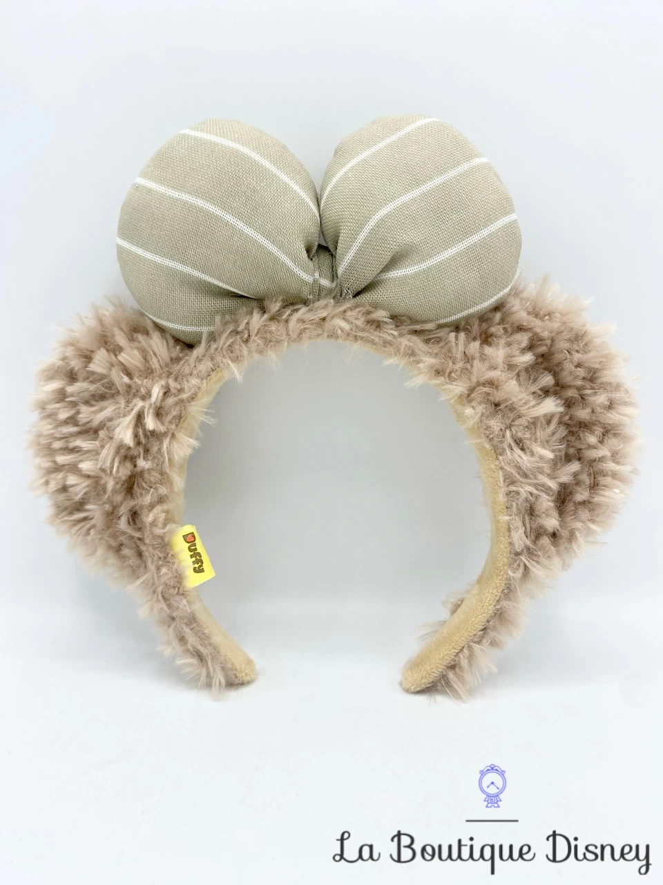 Serre tête ears marron / beige à poils longs représentant Shellie May, la petite oursonne amie de l’ours Duffy. Un gros noeud beige à rayures est présent sur le dessus. Alors, prêts à compléter votre collection ?