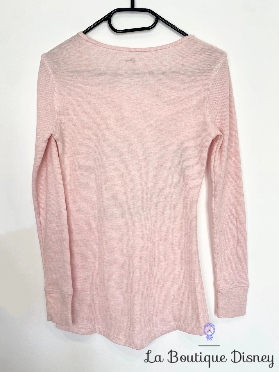 Sweat shirt à col rond et manches longues rose clair à l’effigie de Cendrillon. L’imprimé aux contours noirs représente à la façon d’un dessin le château de la princesse avec le croquis de Cendrillon et l’inscription en noir « Wishes Come True ». Il y a au premier plan l’escarpin, la chaussure de bal de cendrillon avec à l’intérieur une multitude de motifs et d’inscriptions. Dos uni.
