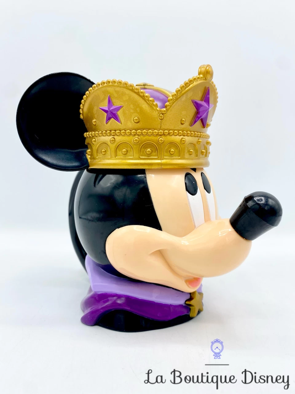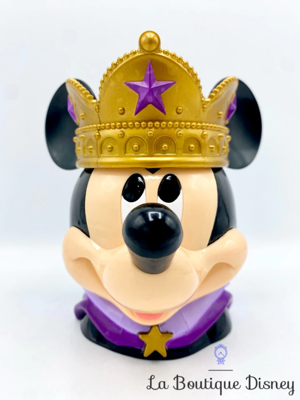 Tasse en plastique de Mickey Mouse en relief 3D. Il est en tenue de roi avec une grosse couronne dorée sur la tête qui s’ouvre comme un couvercle. Mickey porte un vêtement violet et il y a des étoiles sur sa couronne. Mug en plastique très original !