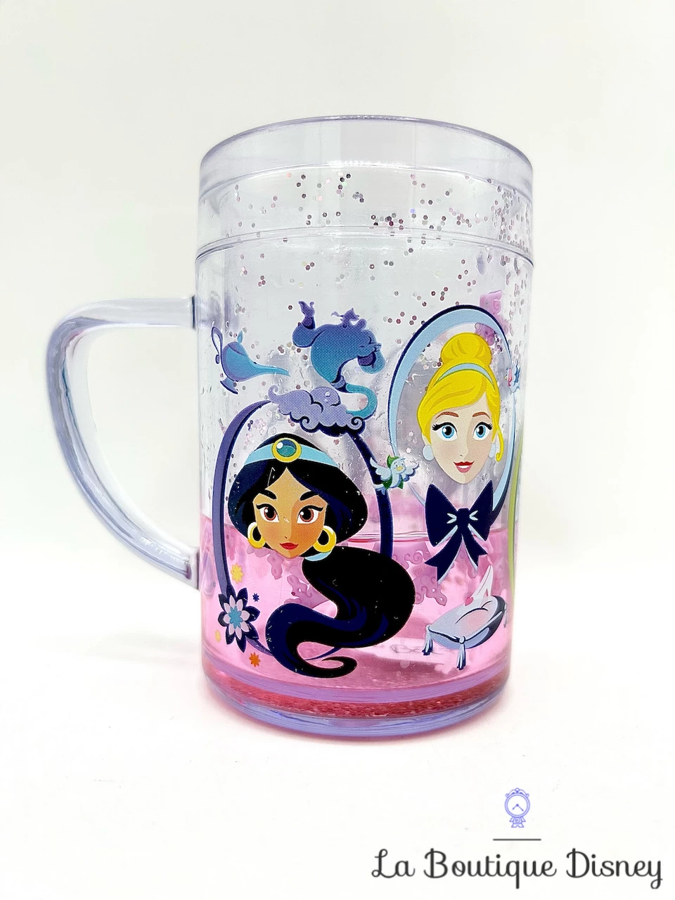 Mug plastique rose et transparent sur le thème des Princesses. Des dessins en fond représentent les visages de différentes princesses : Mulan, Cendrillon, Tiana, Jasmine et Belle. Il y a également des petits motifs avec le prince Naveen en grenouille, Madame Samovar, la pantoufle de verre, un éventail ou encore le Génie de la lampe. La tasse possède une « double paroi » dans laquelle se trouvent de l’eau et des petites paillettes qui se mettent en mouvement quand vous bougez la tasse.