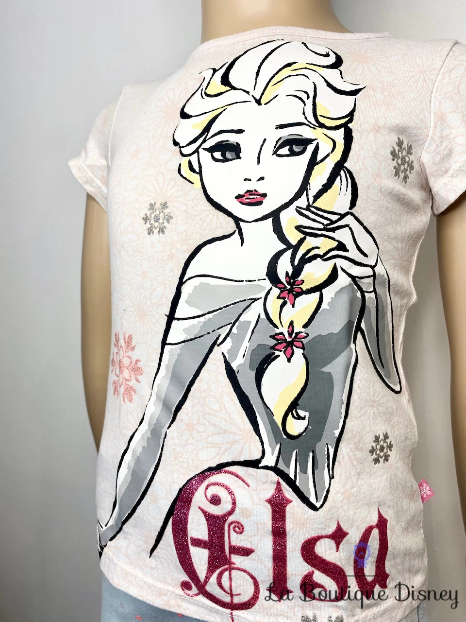 Tee-shirt rose et blanc avec motif imprimé à l’avant de la princesse et reine d’Arendelle, Elsa. Son portrait est imprimé dans de très belles couleurs grises et blanches avec des contours noirs épais. Elle a sa longue tresse blonde. Inscription « Elsa » en dessous en rose à paillettes. Manches courtes. Des flocons de neige viennent parsemer le rester du tee-shirt.