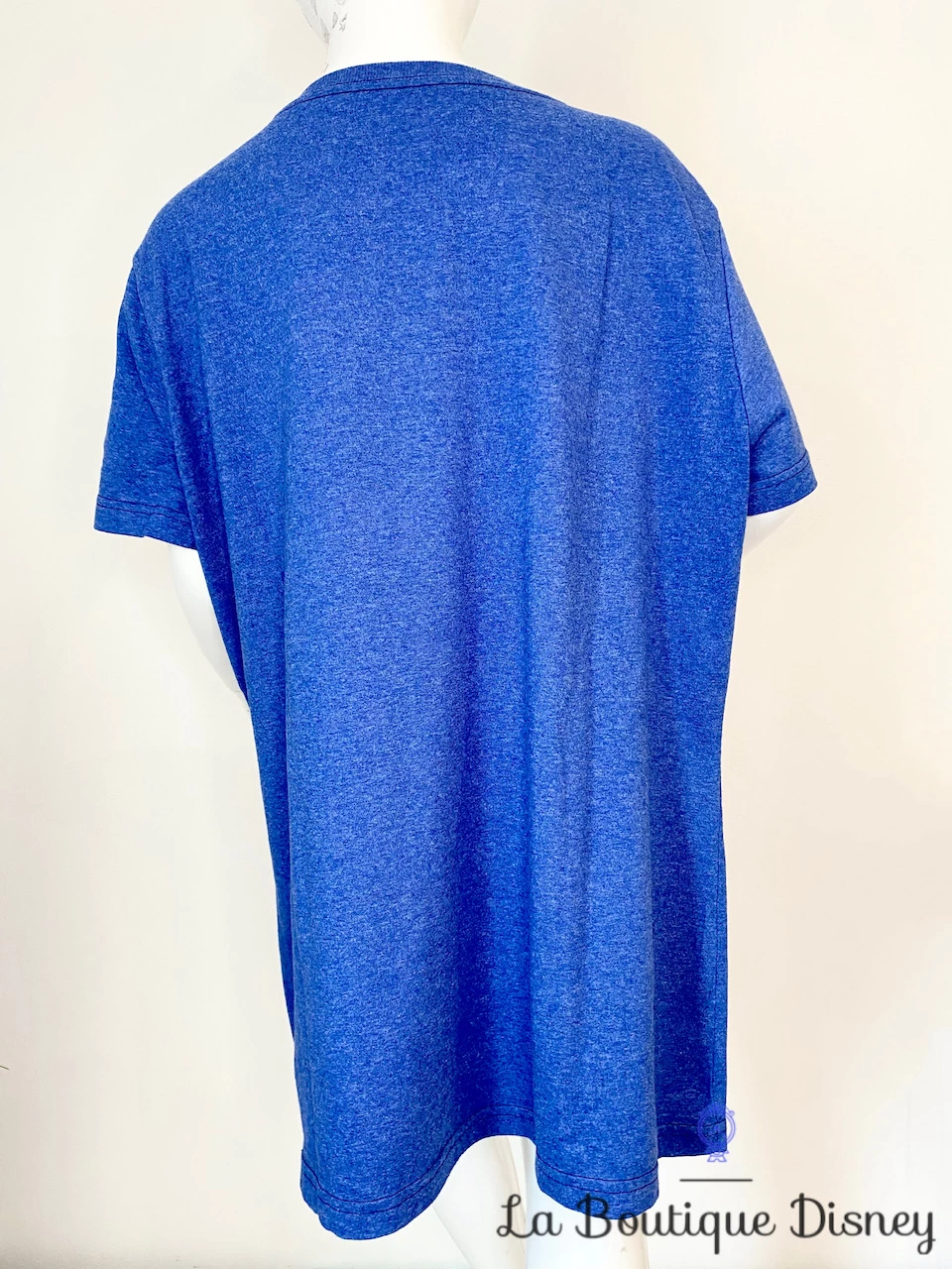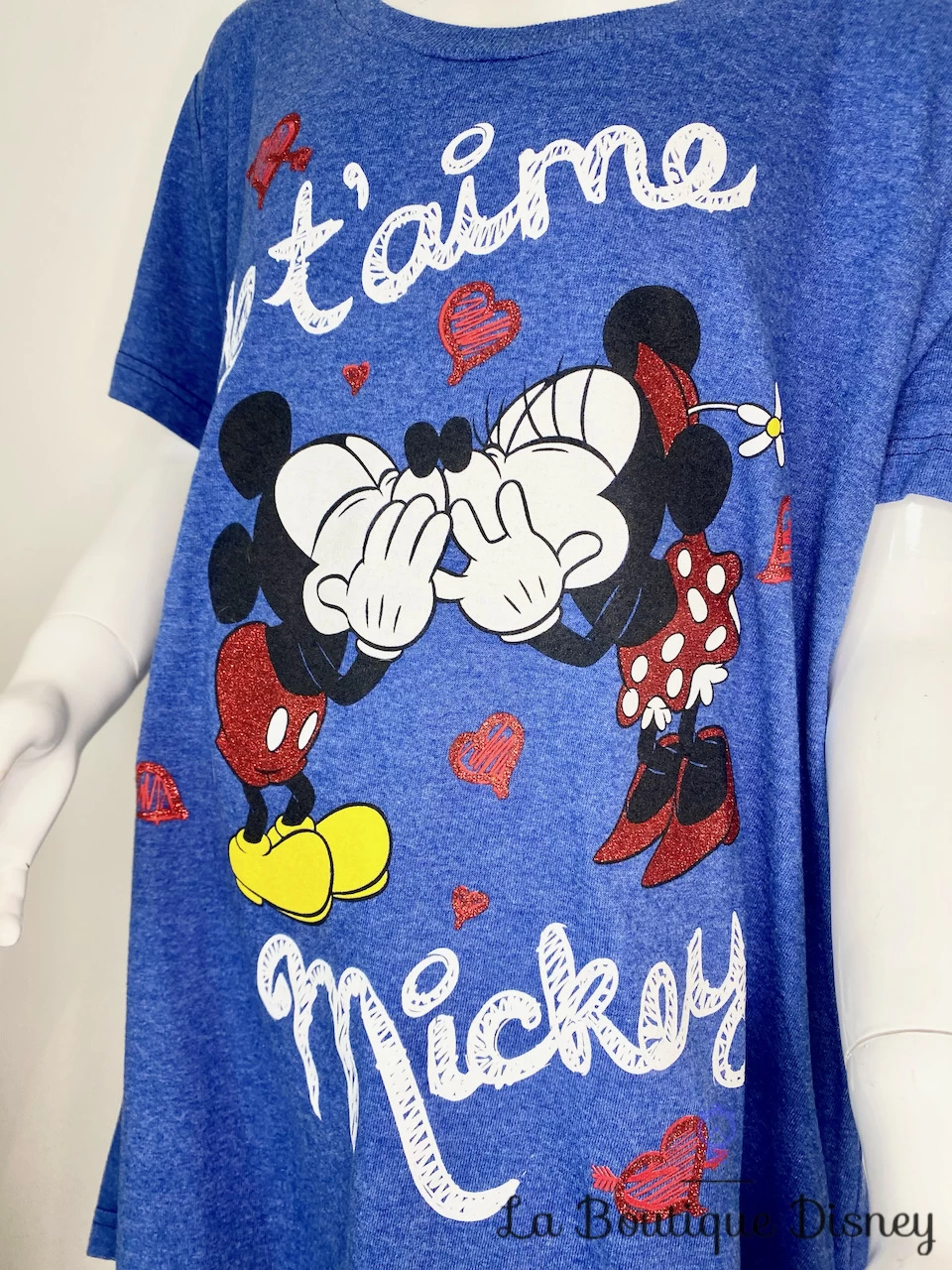 Tee-shirt bleu chiné à manches courtes et col V. Imprimé sur le devant avec dessin dans un style rétro vintage de Mickey et Minnie en train de se faire un bisou. Leurs vêtements sont à paillettes. Il y a des petits coeurs rouges tout autour d’eux. Inscription « Je t’aime Mickey » en blanc. Dos uni.