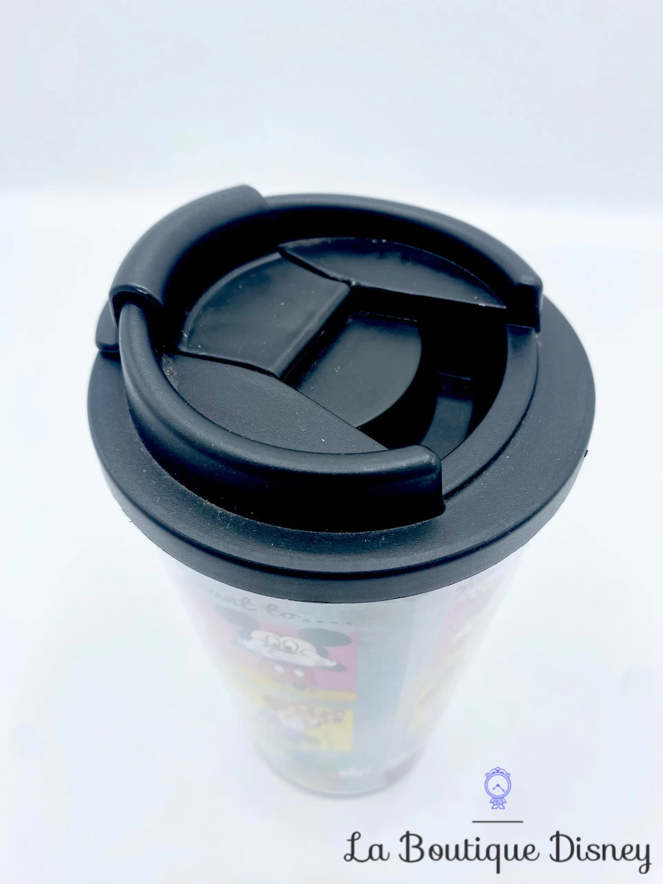 Thermos en plastique transparent avec trois représentations de Mickey et Minnie. Ils sont une fois dans un rectangle rose « Grrrrrr » énervés, une fois dans un rectangle jaune « Tee Hee ! » en train de rire et une fois dans un rectangle vert « Mwah ! » en train de se faire un bisous. En haut il y a l’inscription « You make me want to… ». Les deux faces sont identiques. Mug de voyage entièrement avec couvercle dévissable noir.