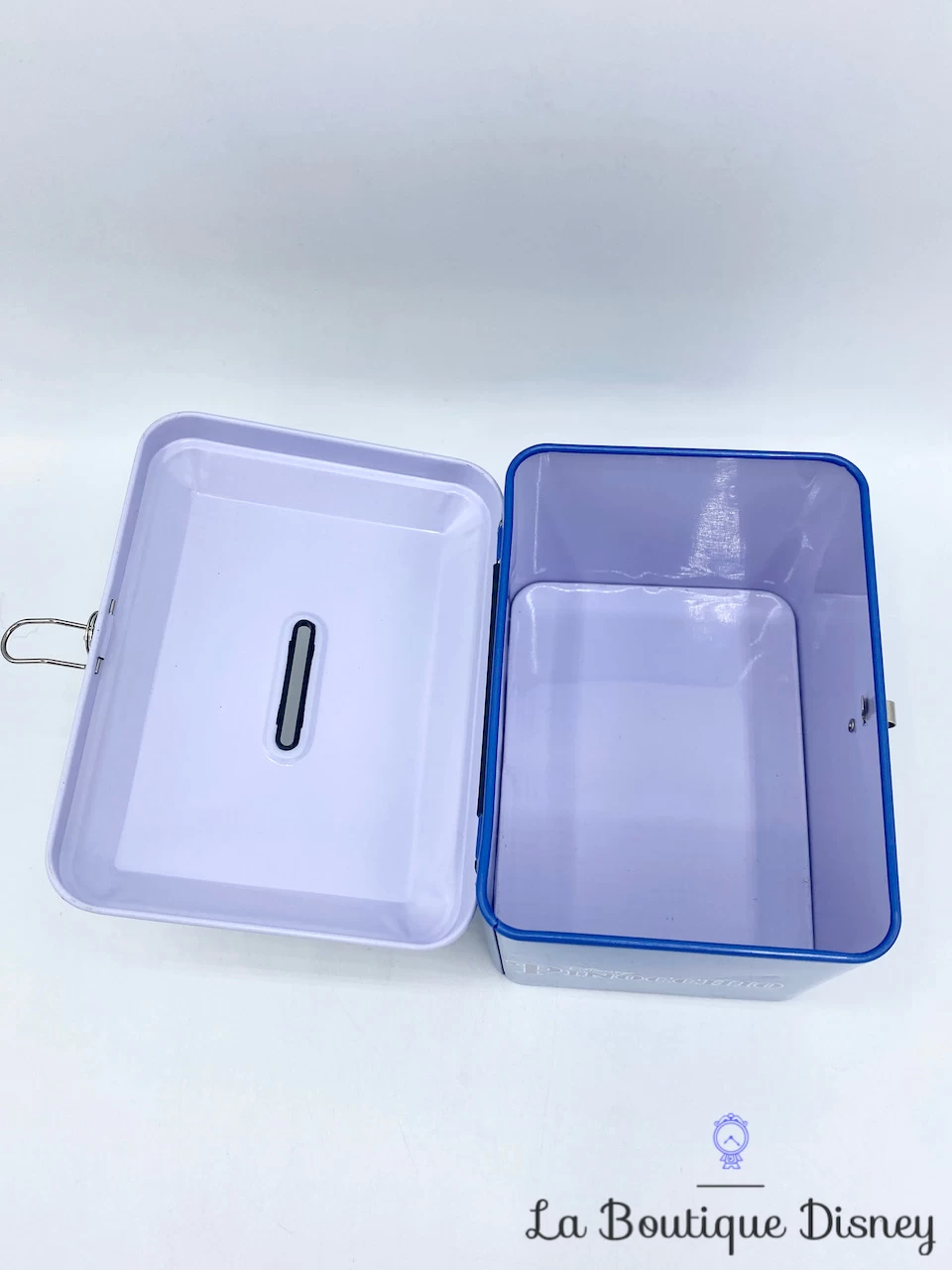 Tirelire en forme de coffret en métal bleu marine avec la plus célèbre des marionnettes Pinocchio représentée sur la face avant et arrière. Pinocchio revêt sa tenue rouge jaune et bleu et porte son chapeau jaune surmonté d’une plume rouge. Il a menti et son nez s’allonge… s’allonge… Son nez est tellement long que Jiminy Cricket, conscience de Pinocchio tient debout dessus ! Sur les deux côtés de la boite, il y a l’inscription « Disney Pinocchio », on la retrouve aussi en dessous. Fente sur le dessus du coffret pour insérer la monnaie. S’ouvre sur le devant grâce à un crochet fermé par un petit cadenas muni de deux clés.