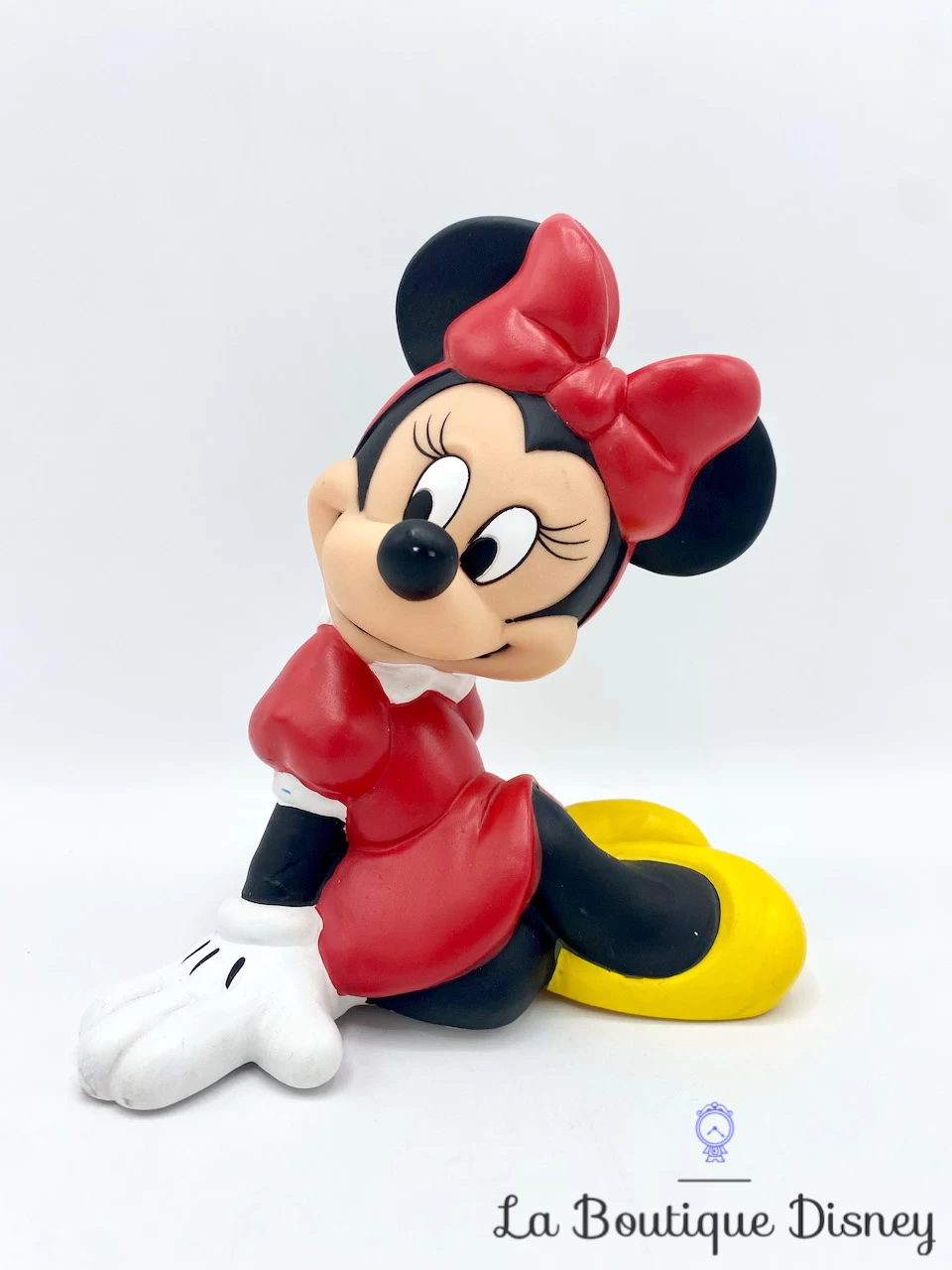 Tirelire en plastique dur représentant la célèbre souris Minnie Mouse. Minnie est assise les bras en arrière. Elle porte une robe rouge et un noeud rouge sur la tête. Une fente est située sur l’arrière de la tirelire et on note un bouchon récupérateur en dessous.