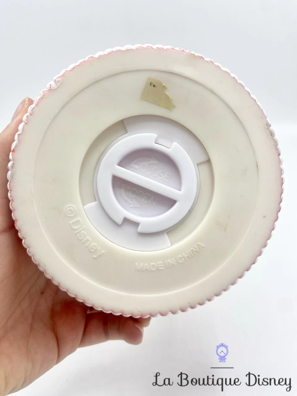 Tirelire en plastique dur représentant la célèbre souris Minnie Mouse. Minnie est debout sur un socle rouge recouvert de petits coeurs roses avec l’inscription « Minnie Mouse » en blanc. Elle porte sa robe habituelle rouge à pois blancs et son noeud sur la tête. Une fente est située sur l’arrière de la tirelire et on note un bouchon récupérateur en dessous.