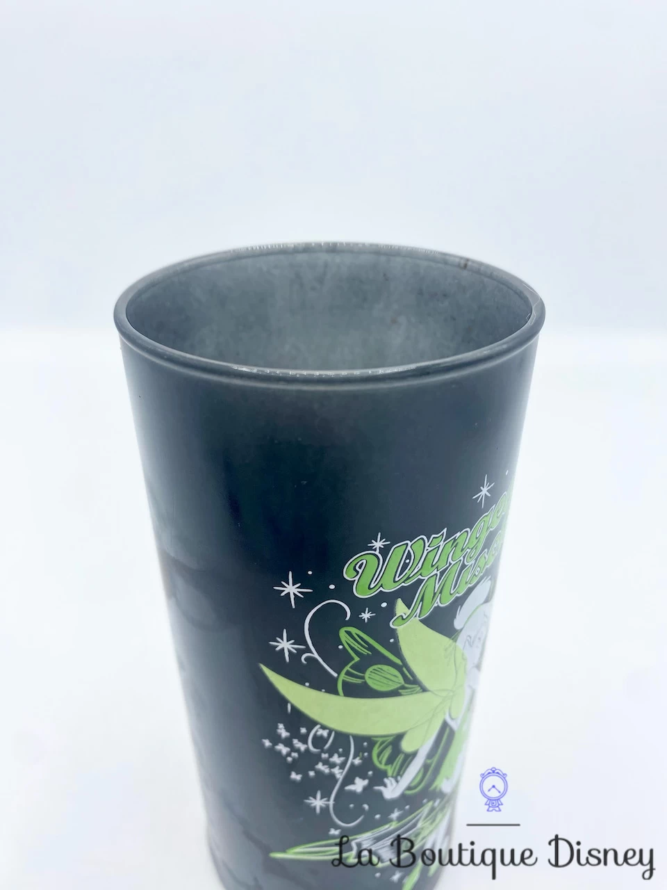 Verre noir avec sur le devant la Fée Clochette dans sa petite robe verte. Elle se trouve devant un grand papillon vert. Inscriptions « Winged Mischief » et « Tinker Bell ».