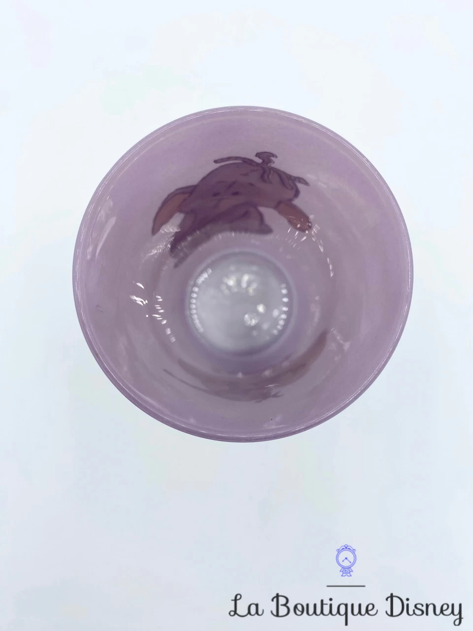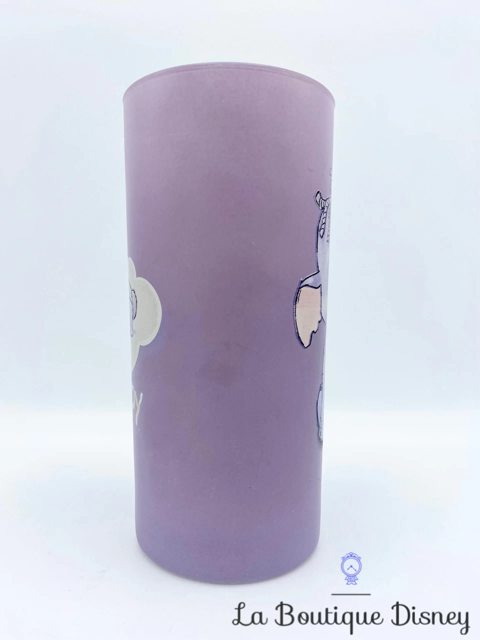 Verre violet avec la représentation sur l’une des faces du célèbre éléphant de la Forêt des Rêves Bleus, Lumpy. Il est assis sur ces pattes arrières et sourit. Sur l’autre face du verre se trouve une autre représentation de lui mais cette fois-ci de profil et sur un nuage. En dessous du célèbre éléphant figure l’inscription « Lumpy » en blanc. Matière : verre.