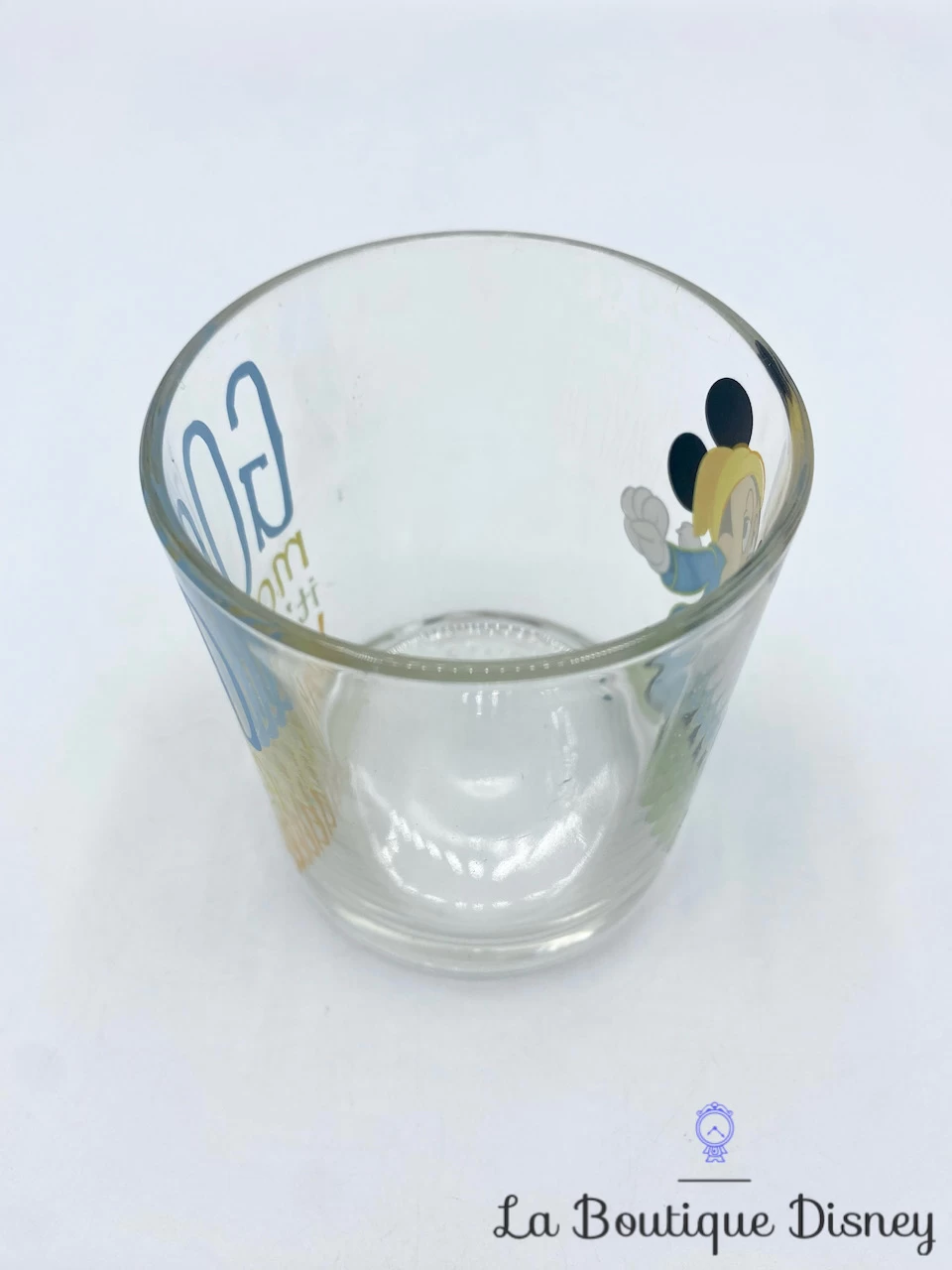 Verre transparent avec sur le devant Mickey Mouse en pyjama bleu, avec un bonnet de nuit jaune et des chaussons lapins verts. Il est en train de bailler. De l’autre côté du verre, est inscrit « Good Morning it’s time to wake up ».