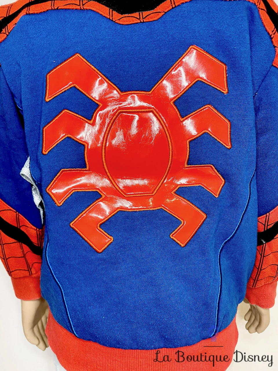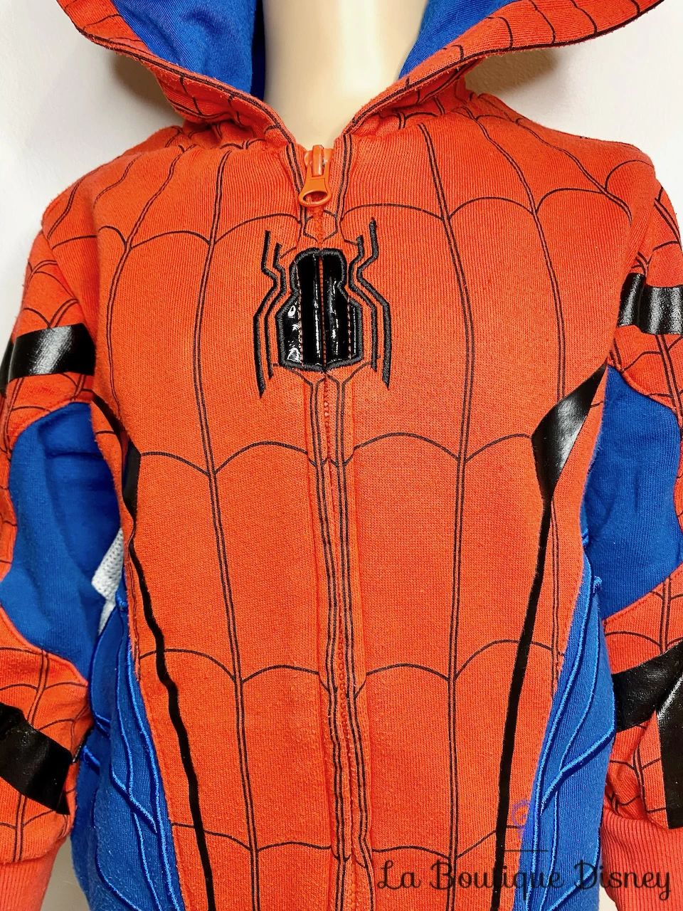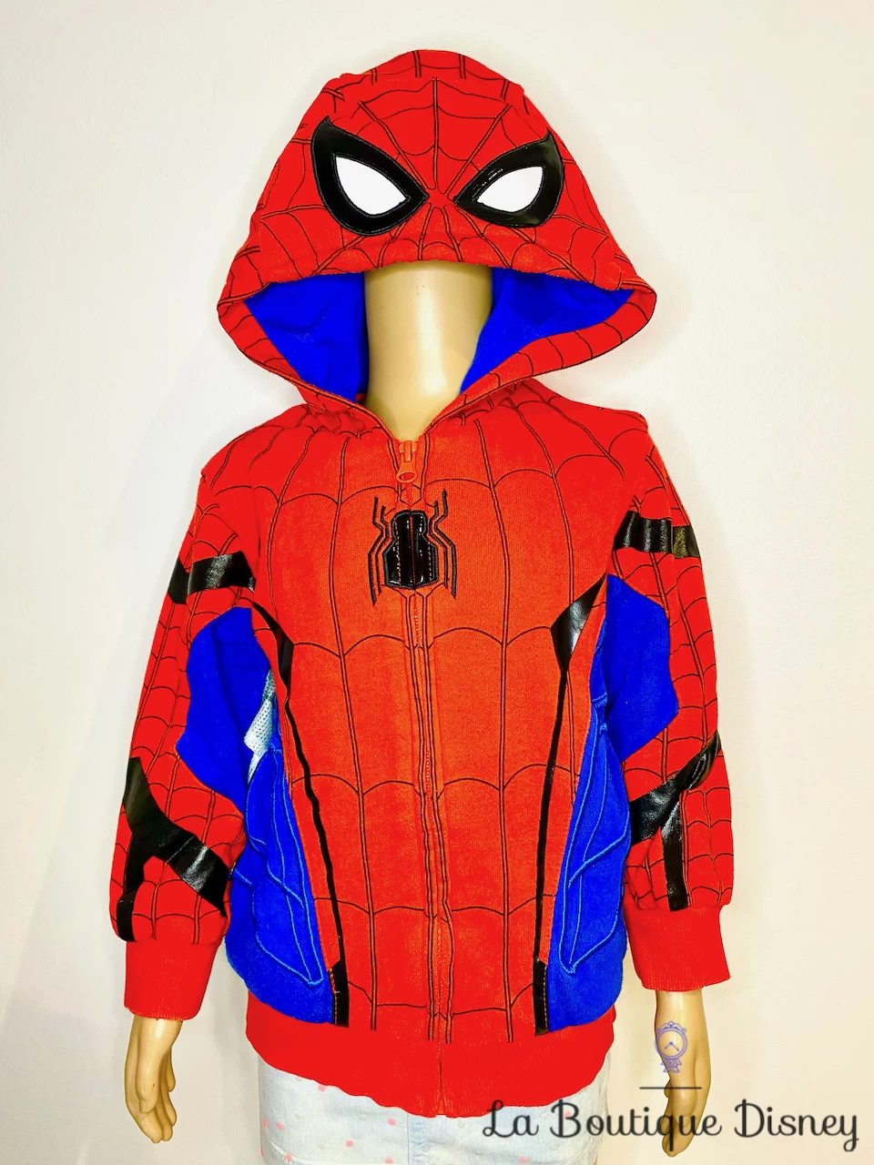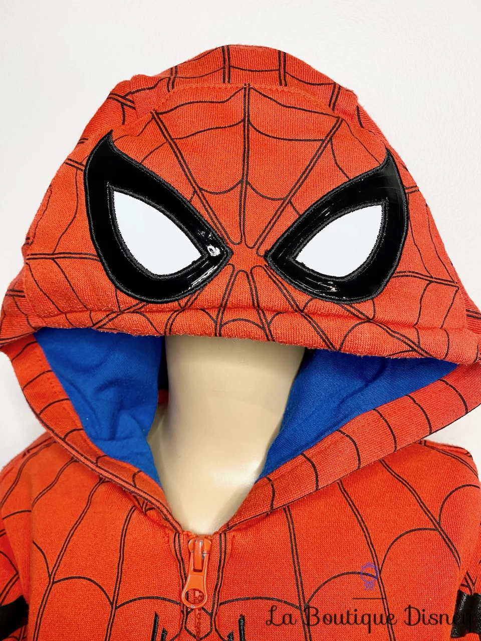Veste 60% polyester, 40% coton de Spiderman, l’homme araignée super héro bleu, rouge et noire. Les motifs imprimés sur la veste forment une toile d’araignée avec au centre le motif plastique d’une araignée noire et quelques bandes assorties. Le dos de la veste est en majorité bleu avec au centre un motif très imposant d’une araignée en plastique rouge. Capuche doublée bleue représentant le masque porté sur le visage de Spiderman. 2 poches sur lde devant. Fermeture intégrale sur le devant pour faciliter l’enfilage. Lorsque votre enfant lèvera les bras, il deviendra un véritable super héro avec un empiècement de tissu couleur toile d’araignée blanc et noir cousu sous les aisselles !